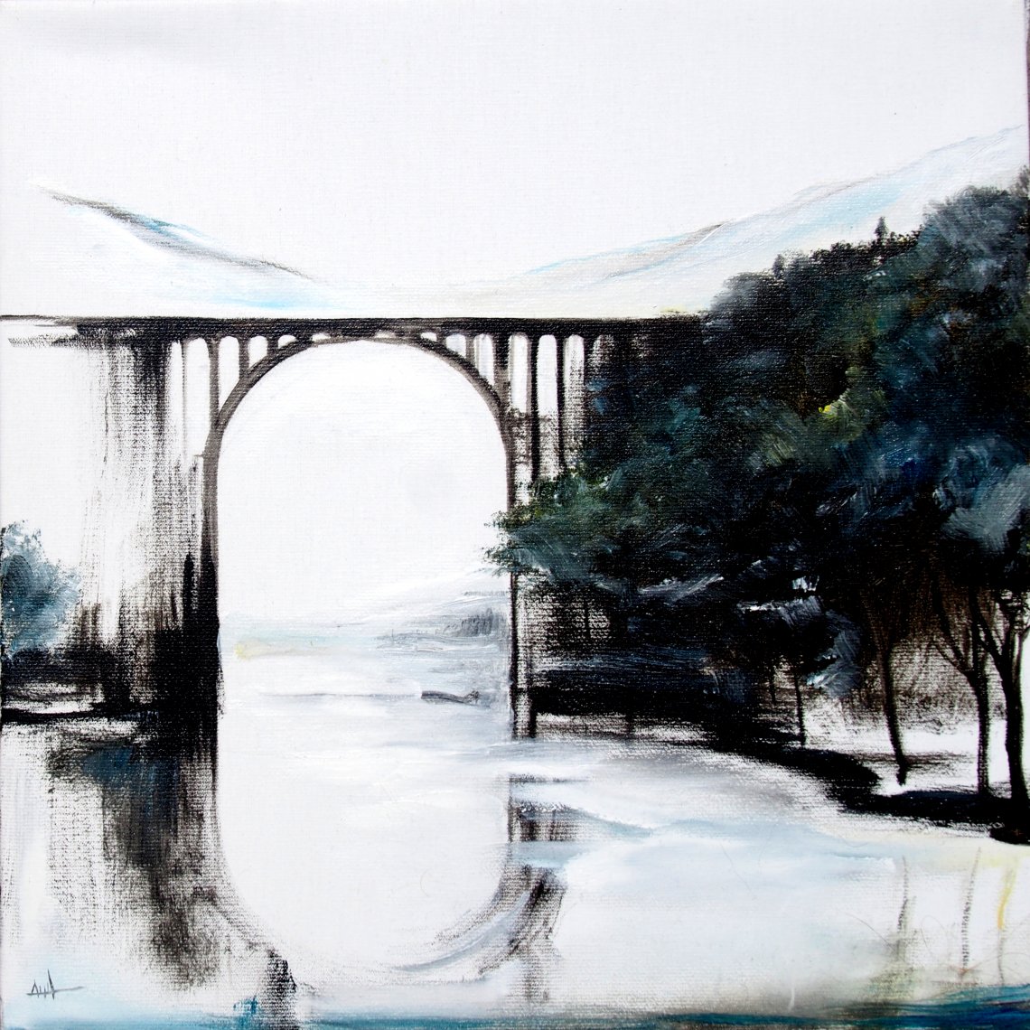 "Ponte Silente" si ispira ad un imponente viadotto ad arco realmente esistente (in Slovenia), che si erge su un corso d'acqua. La struttura, pur essendo solida, è avvolta in un'atmosfera nebbiosa e rarefatta, che ne ammorbidisce i contorni e la fonde con il paesaggio di alberi a destra, sfumati e distorti nel fiume; come fantasmi. L'opera, realizzata con pennellate materiche e gestuali, si colloca tra il figurativo e l'espressionismo tonale, mentre i toni freddi ed il nero profondo creano un'atmosfera suggestiva ed emotiva. Il bianco è invece la tela stessa, rimasta intatta, come un non-finito paesaggistico ma che comunque ritrae emozioni. Il ponte si fa simbolo di unione tra due mondi o due stati d'animo, innalzandosi sopra il velo nebbioso dell'incertezza.