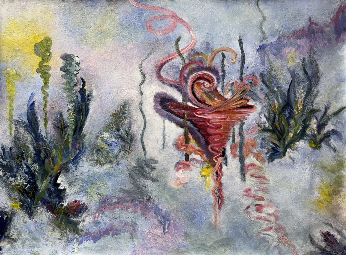 Early Days is conceived as a multisensory immersion into the unnerving rise of authoritarian sentiment in the contemporary United States. The painting’s highly textural surface built from acrylic, oil, and cold wax creates a shifting landscape where organic forms appear to bud, twist, and mutate. What first seems ethereal or embryonic slowly reveals an undercurrent of instability: a visual metaphor for the subtle, early-stage creep of fascistic ideology as it threads itself through civic life.