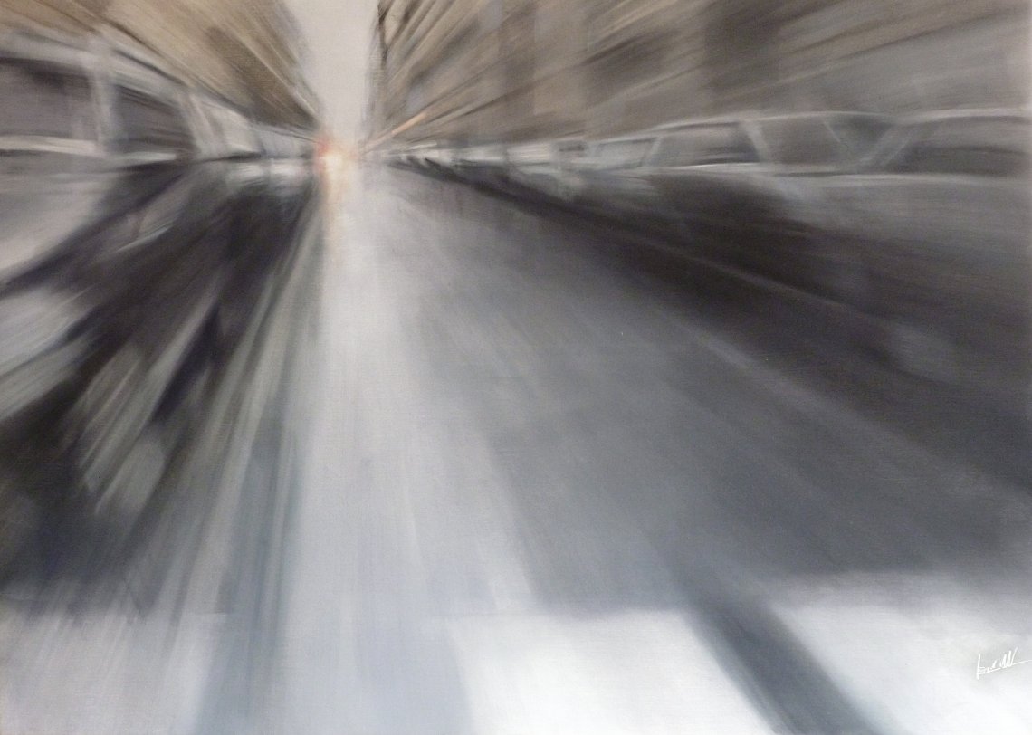 …” un palcoscenico instabile, in perenne trasformazione. Qui avvengono i processi sociopolitici e le dinamiche economiche dei consumi, tutto è dentro il “tempo presente” in mutamento continuo, veloce e inafferrabile, analizzato non più con il sentimento emotivo ma con l' “intelligenza razionale”, dunque i colori sulla tela, via via si raffreddano e si spengono.”