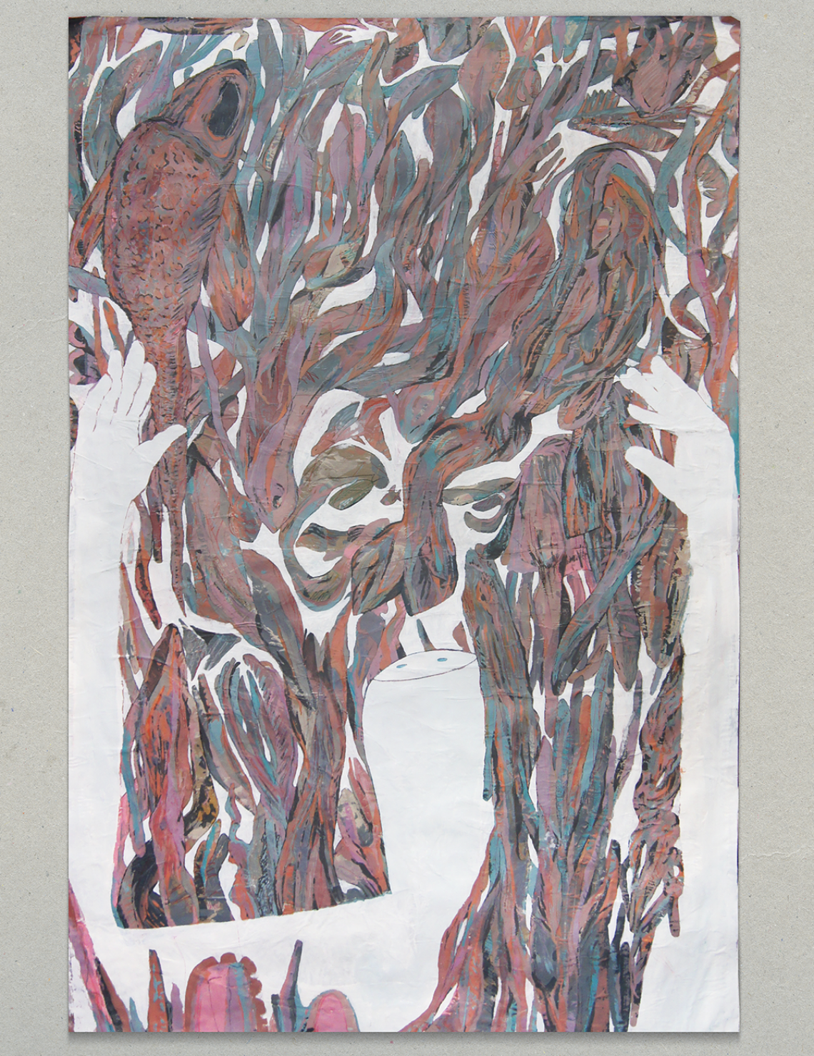 A figure amidst dense aquatic life. I applied color and textures wildly and intuitively and the carved out the animals and the human by painting the white background around. It's creating chaos and then making sense of it, controlling the chaos - on paper as in my mind.