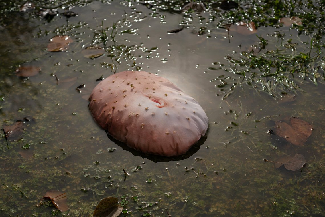 Mixed media, my bally photo printed on fabric and sewed into pillow. Germination process of beans on the surface of the pillow and direct shooting outside.