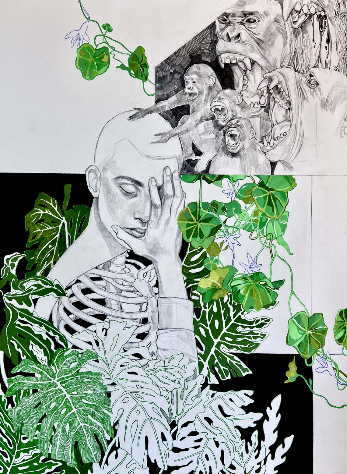 Organic shapes and the graceful movement of flowing lines have always captivated me. In every piece, I strive to distill the intricate patterns found throughout nature, be that capturing the delicate imprint of foliage or transforming the contours of the human form into dynamic, rhythmic designs. Through juxtaposing densely woven lines with expanses of untouched negative space, I create a striking visual contrast reminiscent of sunlight filtering through a canopy of leaves, casting intricate shadows below. Capturing a sense of balance and grounded-ness in the natural world is something I aim to capture in my work. This piece depicts the human being as an organism in a larger ecosystem, inseparably tied to the earth. We are sustained by it and will in turn nourish it after death, a kinship stronger than blood. By viewing ourselves as superior to nature, attempting to defy processes of age and death with technology and filling the world with machines, we upset the natural order that sustains vitality.