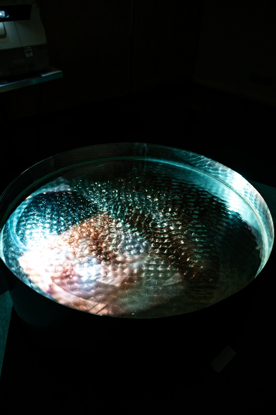 The work runs as a feedback loop between image, sound, and water. Viewers can surf through different frequencies, slightly shifting what becomes visible, but never fully controlling it. Certain settings bring fragments into brief legibility before they slip back into abstraction, so you are always tuning in and out of visibility rather than arriving at a final image.