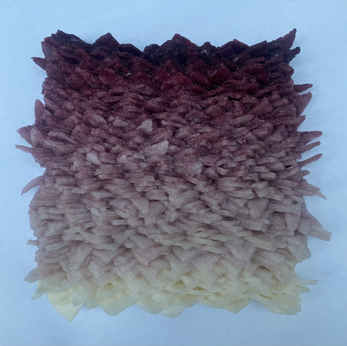 This new work, Tuam 1, uses small, crushed communion wafers and wine to represent the fate of the nameless infants who were callously entombed together in the mass grave at Tuam. The wine is denser at the top, bleeding down through the layers of wafer, creating a meat-like form until it reaches the white, bone-like fragments at the bottom. I