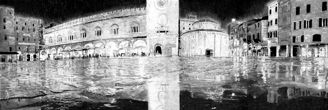 Cielo e acqua sono fatti a matita (grafite) che rende più luminosi i riflessi, mentre gli edifici sono fatti con le matite acquerellabili che sono assolutamente opache e rendono più profondo il disegno