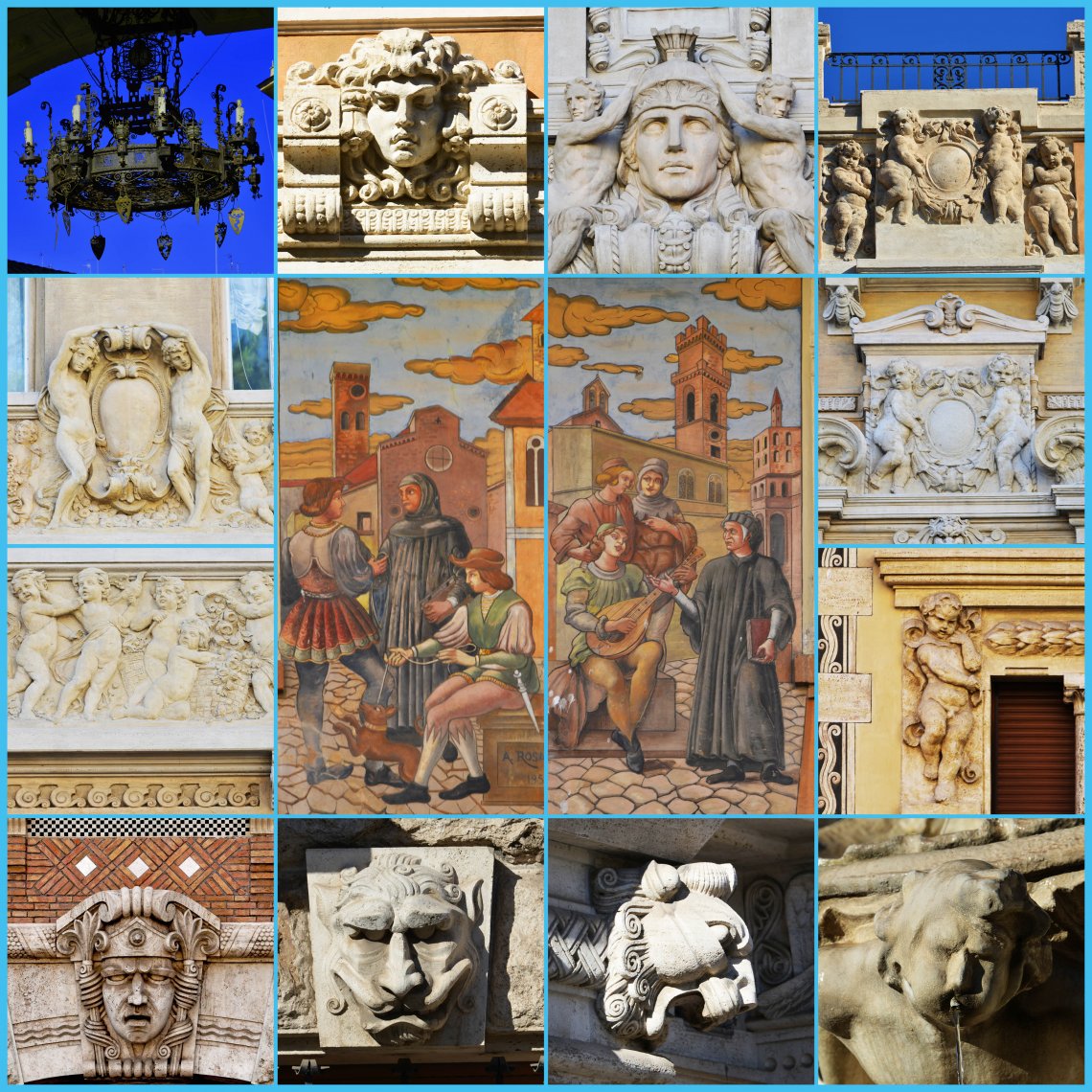 Paradiso/Purgatorio/Inferno collage di immagini del di opere decorative del Quartiere Coppedè di Roma.