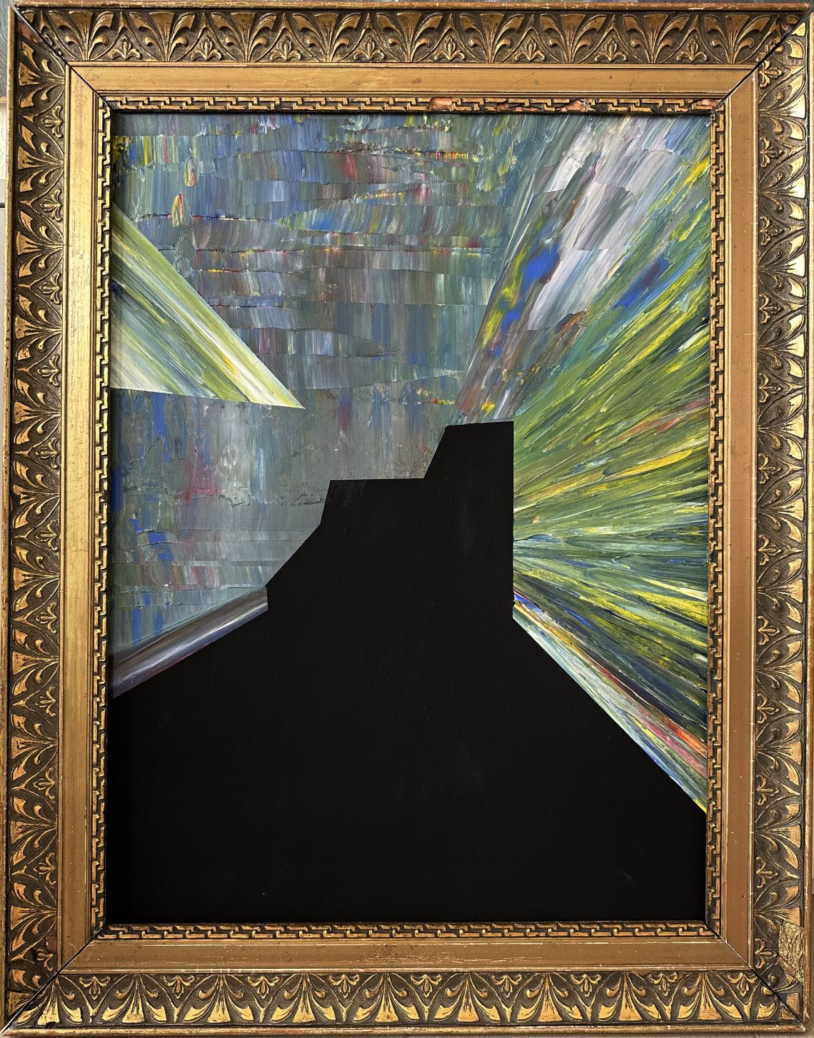This work is the first in a planned series inspired by algorithmic errors in Google Street View, particularly the appearance of black, geometric forms disrupting the landscape. These alien elements—resembling an abyss, a black hole, or an object from another dimension—carry strong emotional weight and suggest mystery and the existence of parallel worlds. The aim of the painting is not literal depiction, but a painterly interpretation that evokes sensations and emotions similar to those experienced while navigating digital maps.
