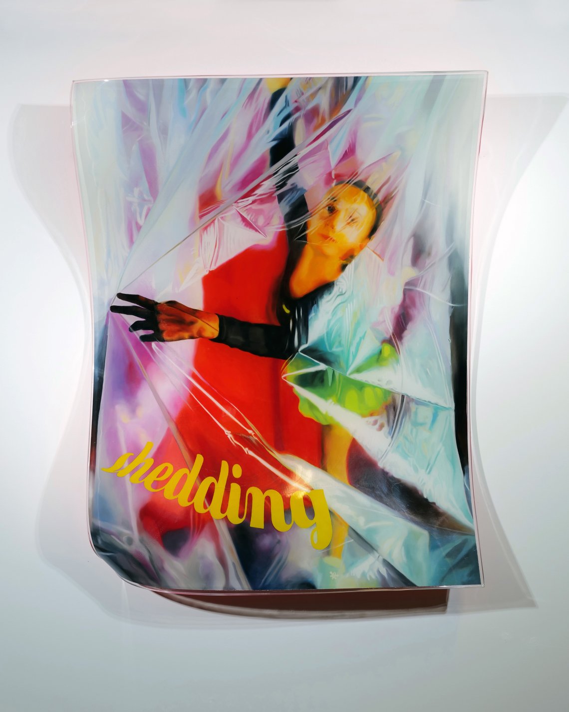 La scritta “shedding” agisce come segnale grafico e dichiarazione: nominare la muta significa renderla visibile, farne un atto di potere. L’opera mette in corto circuito figura e superficie, desiderio e controllo, rivelando la metamorfosi come unica forma possibile di presenza.