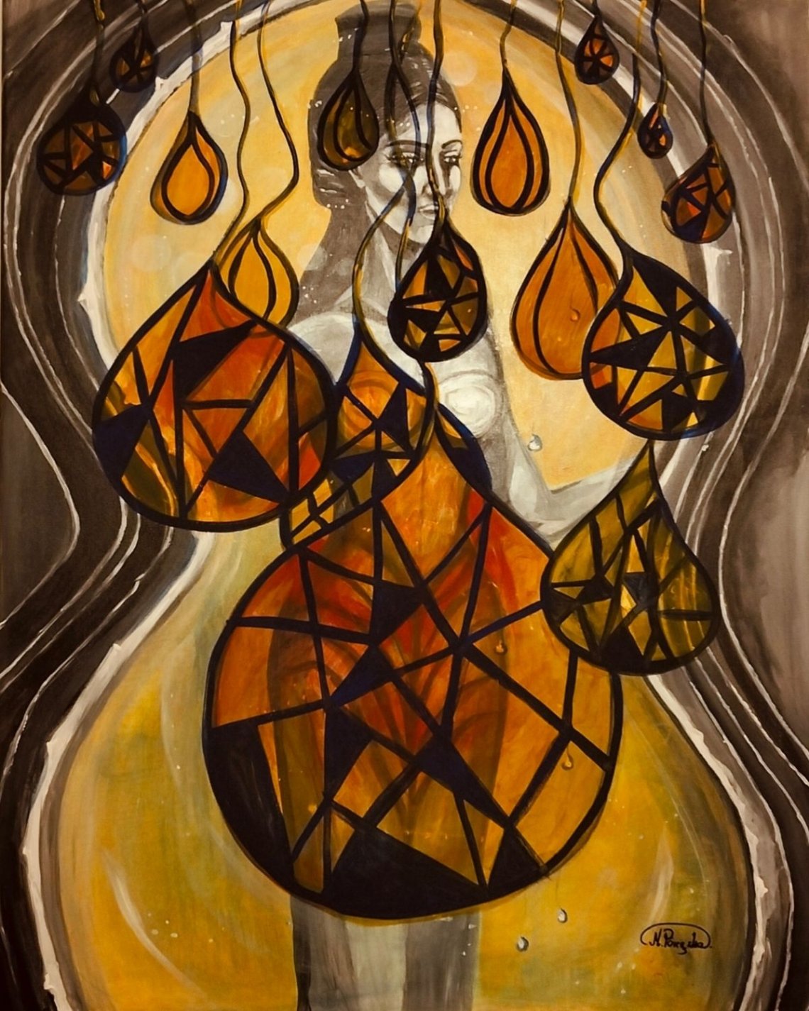 The work depicts a female figure suspended between figuration and abstraction. The surrounding teardrop-shaped forms, rendered in warm shades of gold and amber and intersected by geometric lines, symbolize emotions, memory, and inner tension. The contrast between the softly modeled body and the bold, stained-glass-like structures emphasizes the coexistence of fragility and strength. A luminous aura encircling the head lends the composition an iconic, almost sacred quality, suggesting a spiritual and introspective dimension. Overall, the work reflects on transformation and the condition of contemporary femininity.