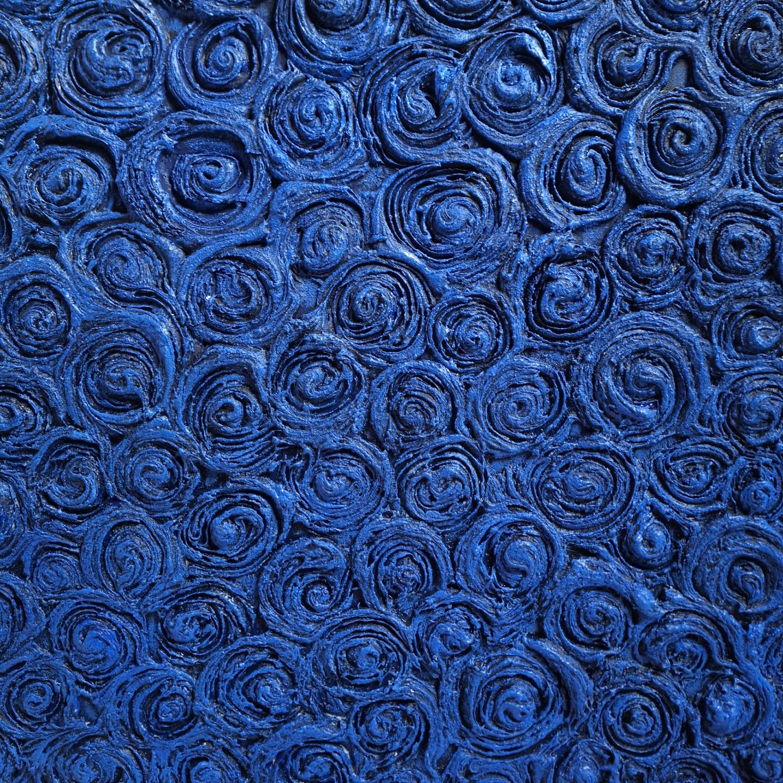 Blu Infinito. Una distesa materica composta da circa cento rose modellate singolarmente, che trasformano la superficie in un unica esperienza visiva e tattile. La ripetizione del modulo floreale genera un ritmo compatto, evocando una coralità di voci femminili che si sostengono reciprocamente. L’opera si costruisce attorno al blu, non inteso come colore passionale — tradizionalmente associato al rosso — ma come tonalità dell’amore più profondo, stabile e introspettivo. Le variazioni di blu che emergono sui rilievi dei petali, illuminate da toni più chiari, introducono una vibrazione luminosa che rompe l’uniformità del campo cromatico, facendo sbocciare le rose nella loro bellezza. In questo equilibrio tra densità materica e respiro cromatico si articola un omaggio alla forza femminile: resiliente, silenziosa, capace di fiorire collettivamente e di mantenere una propria luce anche nelle profondità più intense.