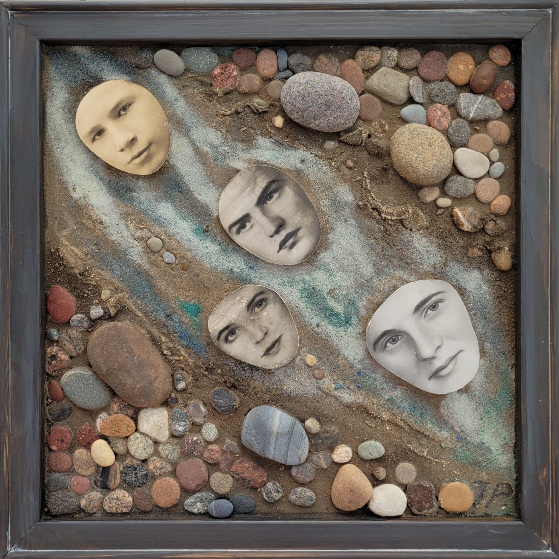 "On the Styx" format 50x50x5cm, assemblage (materials: photos, stones, colored sand), 2025