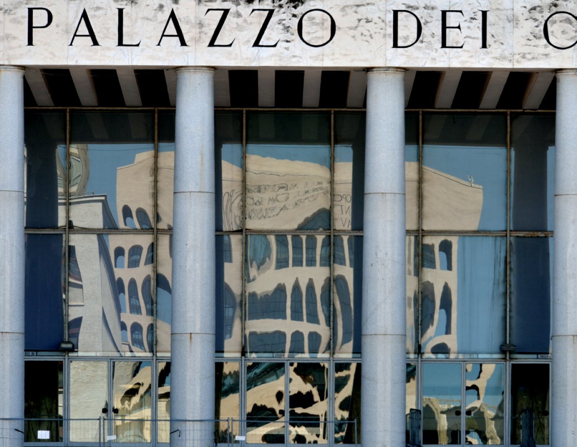 Fotografia delle vetrate del Palazzo dei Congressi a Roma Eur, che riflettono il palazzo della Civiltà Italiana (denominato anche Colosseo Quadrato) posto di fronte, deformandone l'immagine in modo surrealista. Stampa UV su plexiglass con fondo in dibond, cm 80x60, stampa n. 2 di limited edition certificata 3 sole stampe.