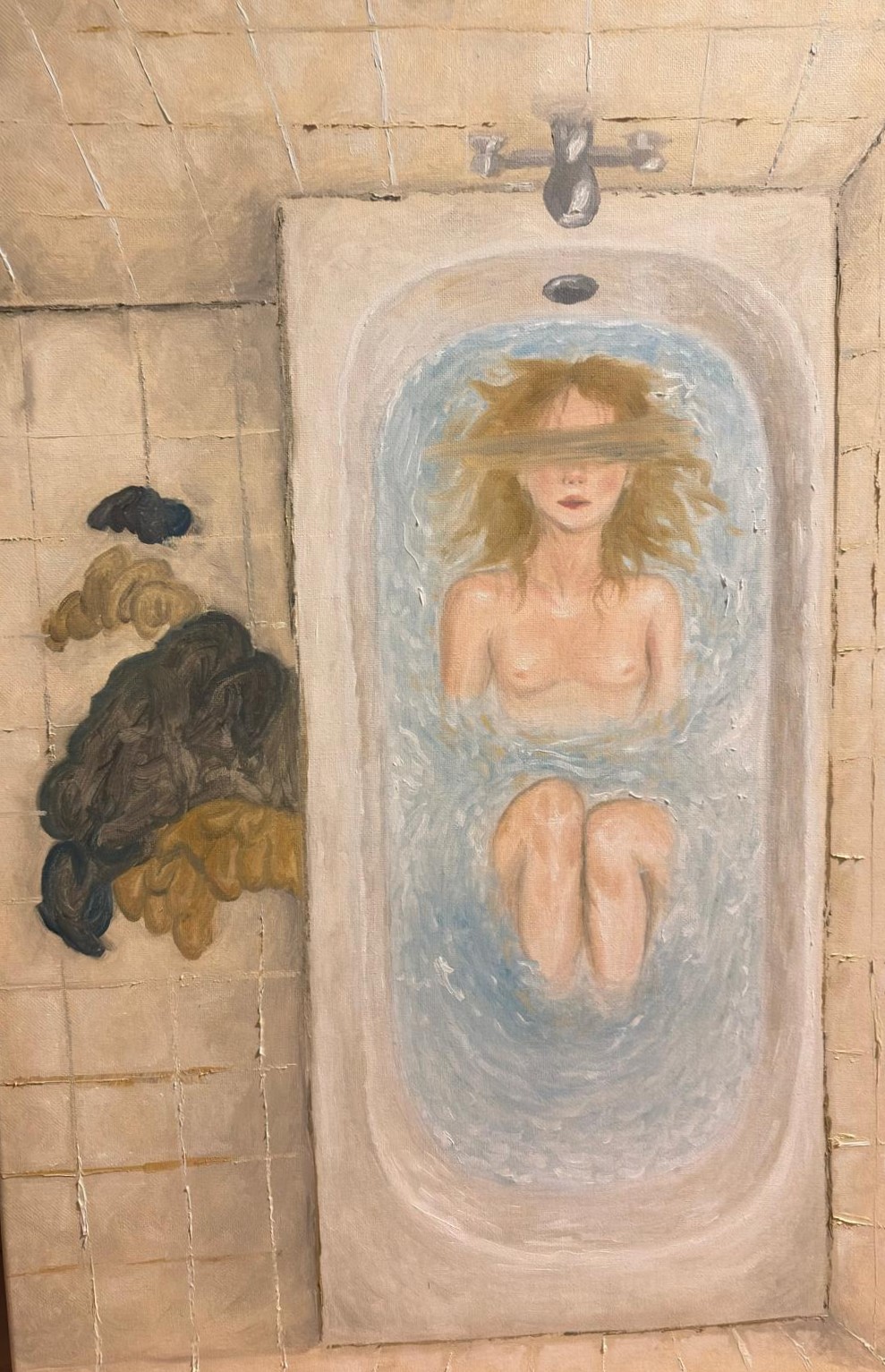 This painting depicts a suspended moment of vulnerability and containment. The submerged figure appears caught between presence and erasure, with the obscured face preventing direct identification. The bath functions as both a domestic object and a psychological space — a site of retreat, exposure, and pause.
