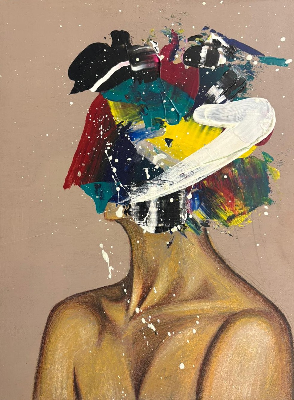 This abstract portrait removes facial features and replaces them with layered, feathery gestures. The dissolution of the face shifts attention away from appearance toward emotional presence. The work suggests fragility, transition, and the porous nature of identity, where the self feels both visible and in the process of fading.