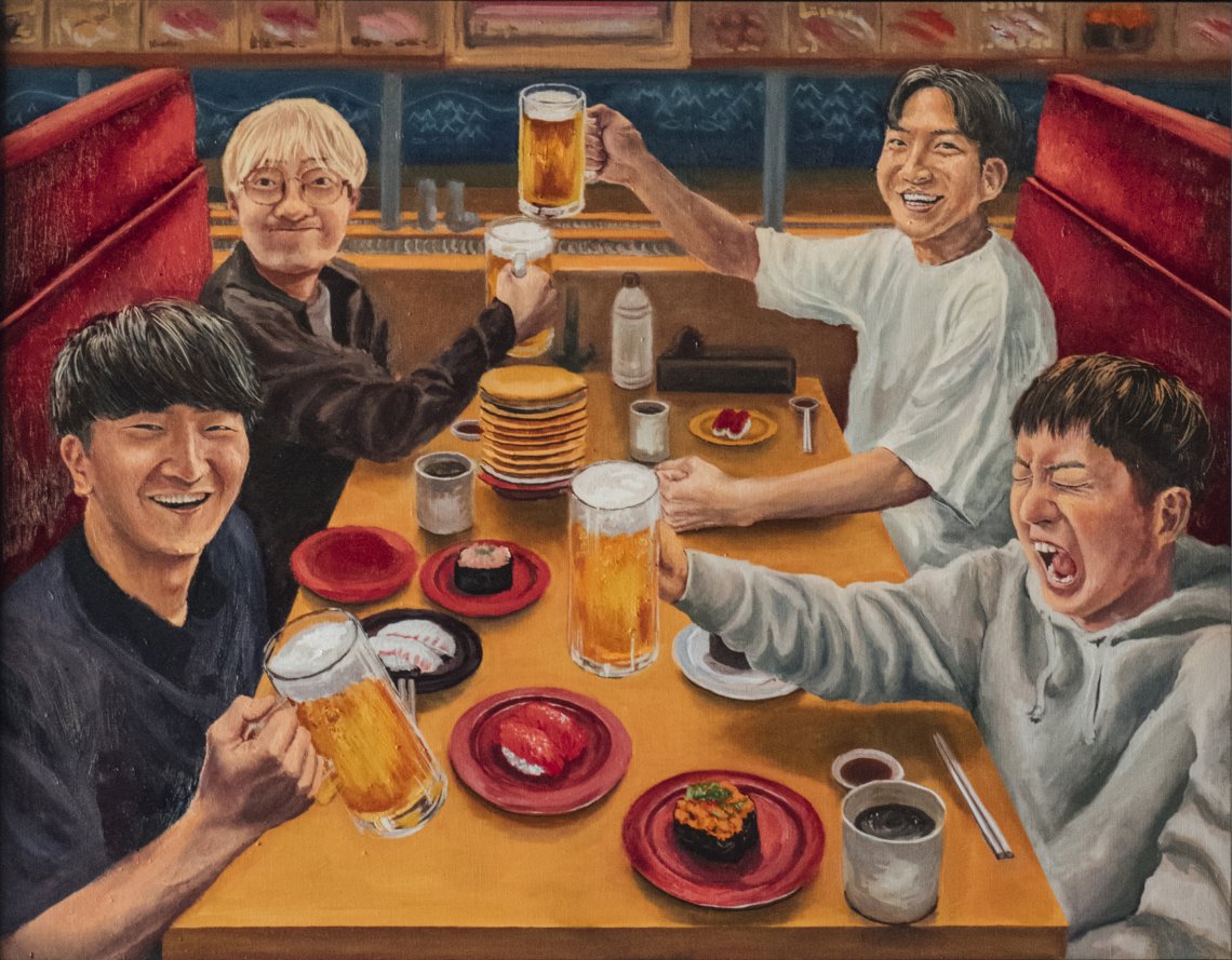 My friends and I always stop at this restaurant for dinner on our way back from watching concerts. We grab seats by the sushi conveyor belt, toast with full glasses, and talk about the songs and scenes that moved us the most. I love these memories, so I wanted to turn them into a painting. Particularly, I wanted to focus on facial expressions and emphasize them so that each person's emotions would be easier to convey.