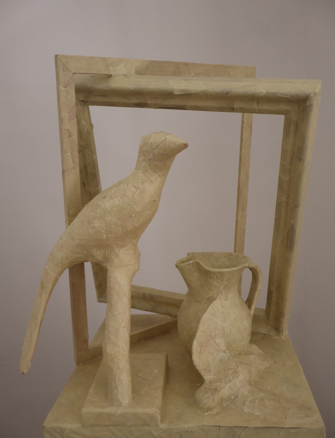 Una composizione “di genere” che diventa inusuale e inquietante per la presenza di uccelli imbalsamati, la cui “morte” è stata condizione necessaria per renderli, cinicamente, elementi decorativi. Il rivestimento con nastro adesivo cartaceo, oltre a trasformare tutto in una surreale scultura, vuole sublimare il ruolo dei vari componenti, spostandoli in una dimensione metafisica dove, eterni e spersonalizzati, diventano testimoni muti della solitudine e dell’isolamento, tipici del nostro tempo. Una realtà trasfigurata, quindi, per poter osservare le cose da un diverso punto di vista. E magari riflettere sul problematico rapporto che abbiamo con gli altri e con la natura.