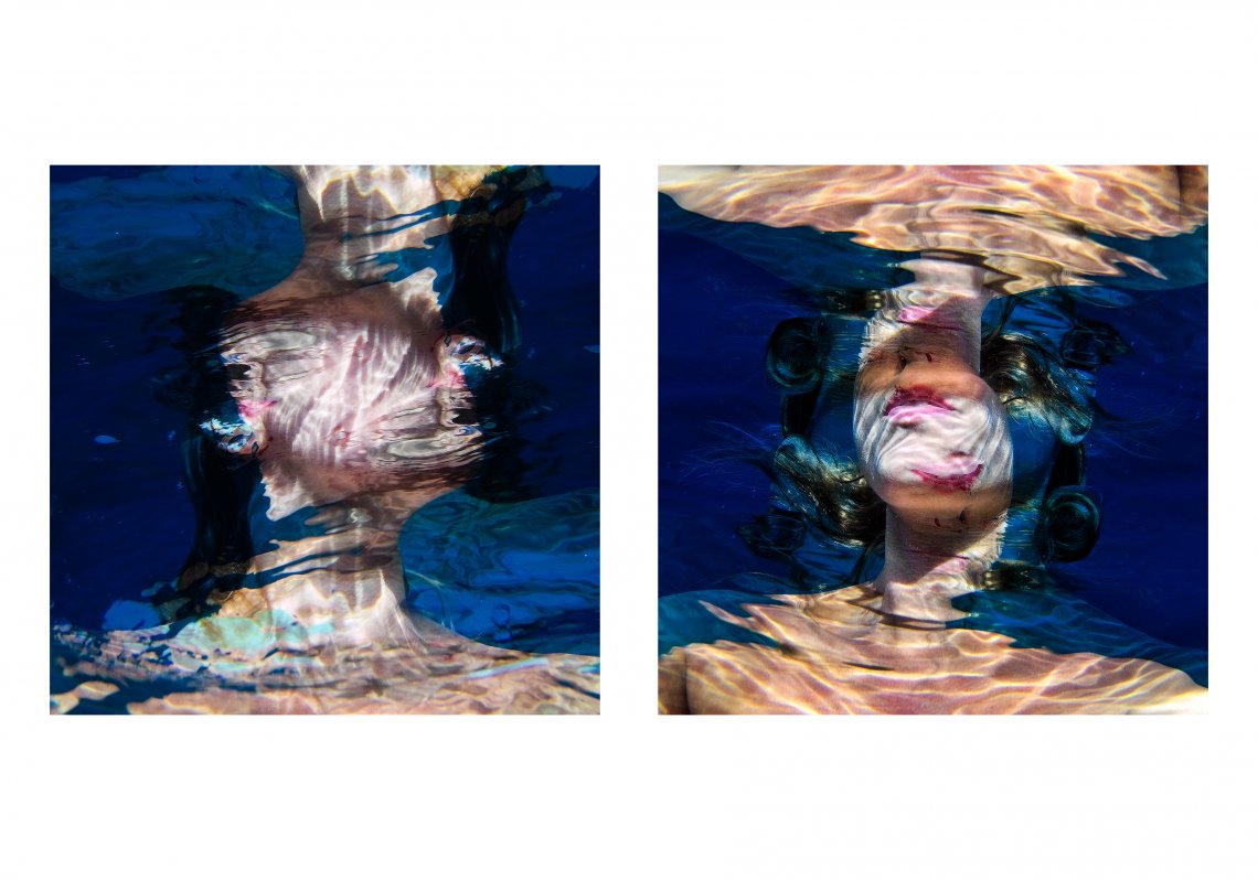 In questo autoritratto, l’opera è concepita come una sorta di loop fotografico. Le due fotografie colgono il soggetto nel momento dell’immersione o dell’emersione. Questo, si trova a mezz’acqua in una congiunzione metaforica tra due mondi paralleli e antitetici in uno stato di sospensione. Il medesimo scatto, in fase di postproduzione, è sovrapposto in modo speculare a sé stesso e vuole suggerire il momento in cui le due forze opposte, luna verso il basso, l’altra verso l’alto, si annullano.