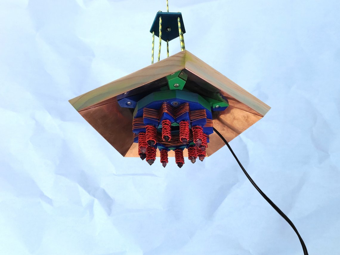 Brought forth as an implementation from the Akashic records, the pentagonal apex is made of wood and is inlaid with copper. The inside of this apex holds a rodin coil that has a clear quartz crystal which is wrapped in magnetic copper wire coming out of each one of the 12 points of the rodin star coil. The center of the rodin coil and of the apex itself holds a Sirius contact crystal that has been imbued with the frequency of the Sirius star. The roding coil itself is connected to a small amplifier that allows for frequencies that are being played on a tablet or a phone to be pumped through the apex, resulting in a silent humming sound. The audience is invited to sit or stand underneath this rodin coil imbued apex in order to experience a subtle frequency shower.