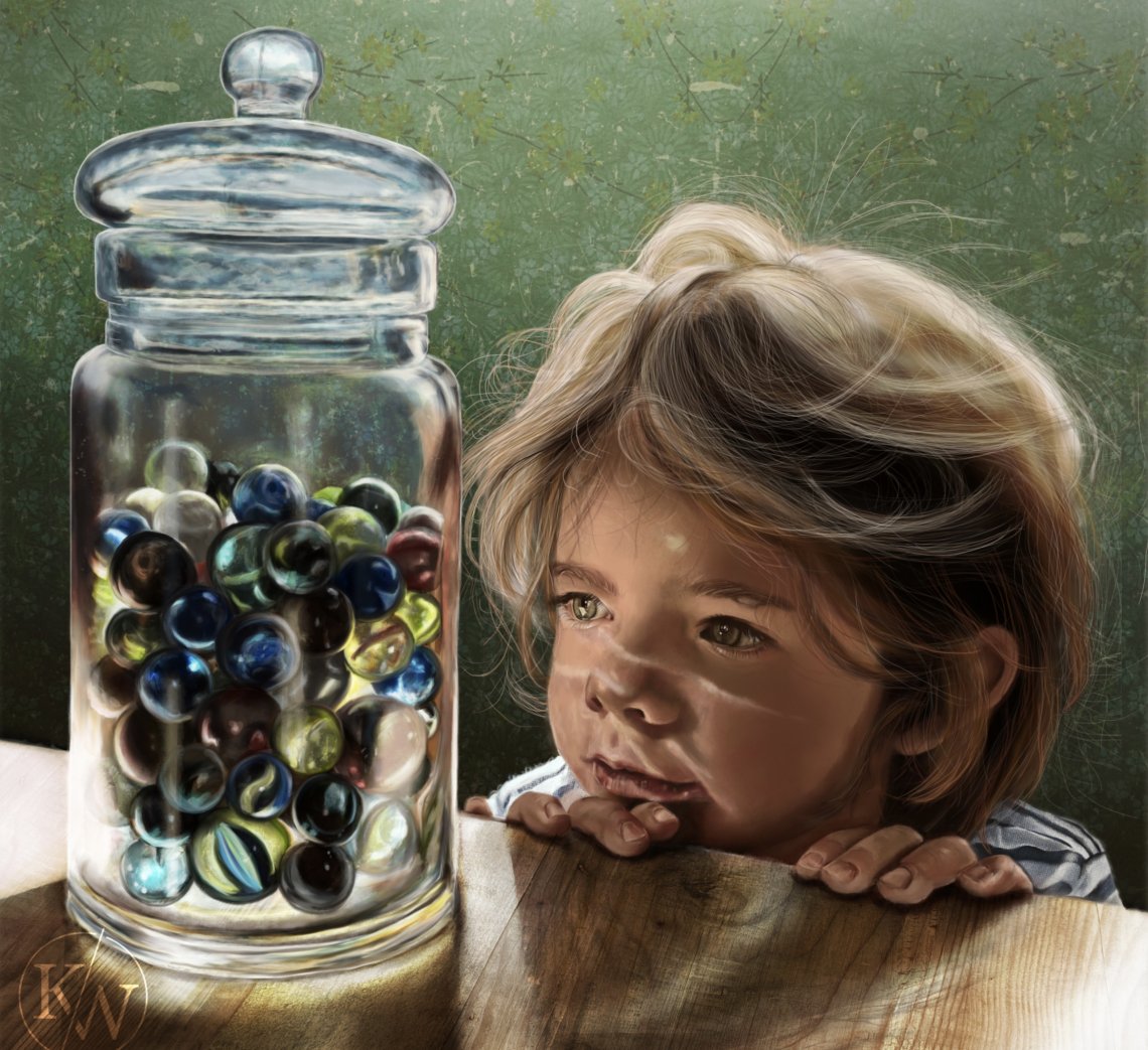 110 cm x 116 cm, Mixed Media on paper. Marble Balls is part of the series CHILD. The glass full of marbles is a simple object. But children have the ability to see beauty and importance in small things. This little child lives in exactly that moment. It forgets everything around. It's dedication lies on itself watching the light and colors of the marble glass. This childish focus on the moment is what the series CHILD is about.