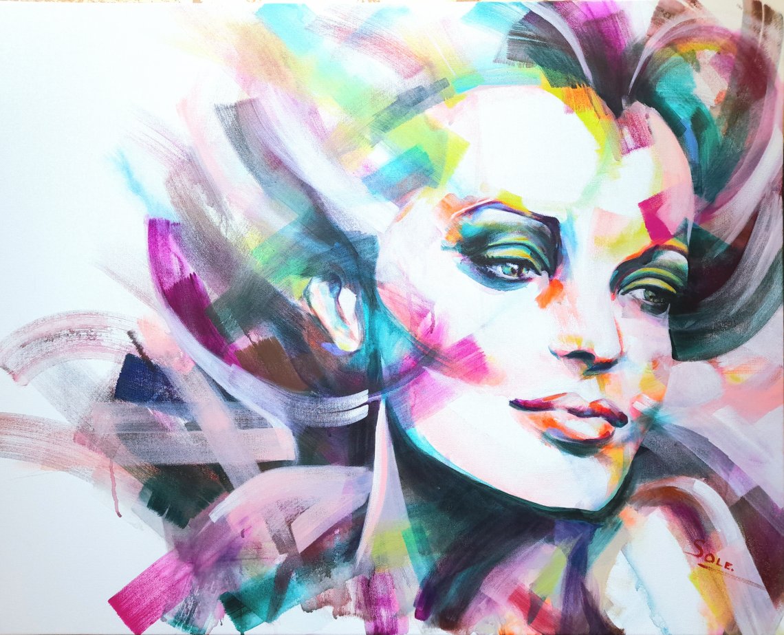 This work is done in acrylic on canvas, 100x80cm using bright colors in large brushstrokes.