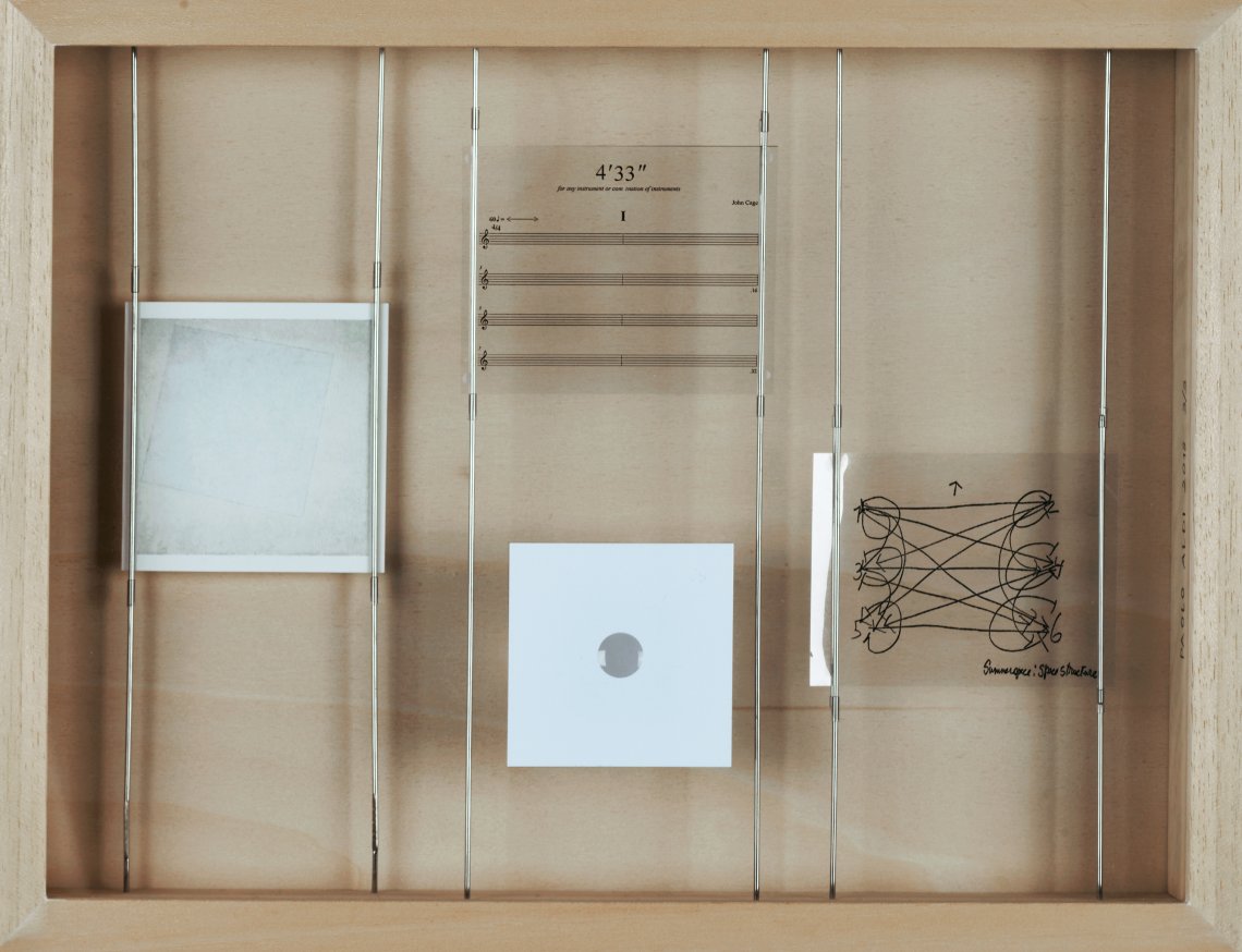 34x44 sono le misure in centimetri del box; in numerologia rappresentano l’equilibrio e l’assoluto. Le annotazioni evidenti sono riferimenti a Kazimir Malevic, John Cage e Merce Cunningham. La foto di Bianco su bianco di Malevich, lo spartito di 3’44” (Silence) di John Cage e il disegno di una coreografia di Merce Cunningham. Per ognuno di essi queste opere sono tracce della loro ricerca dell’equilibrio e dell’assoluto.