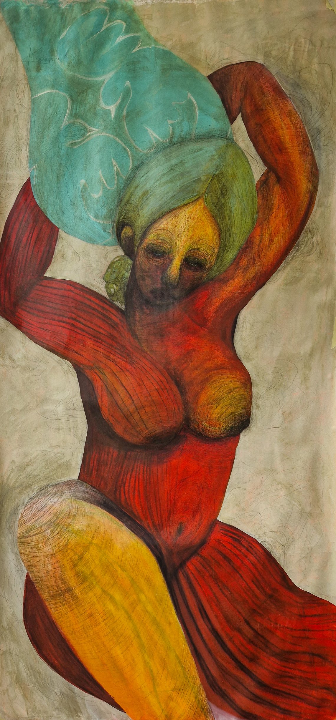 The focal point of the painting is a striking, nude woman painted in vibrant shades of red. Her nudity symbolizes vulnerability and the raw, unfiltered essence of humanity, stripped of all pretense. Yet, her unwavering determination and fortitude are evident as she balances an enormous vase upon her head. This vase, towering above her, is a metaphor for the burdens and responsibilities that the people of Ukraine have had to bear during the war. The woman's red hue represents both her vulnerability and her fiery determination. The color red has long been associated with passion, courage, and the human spirit's unyielding nature. It is as if she draws strength from within herself, embodying the very essence of Ukraine's enduring spirit.