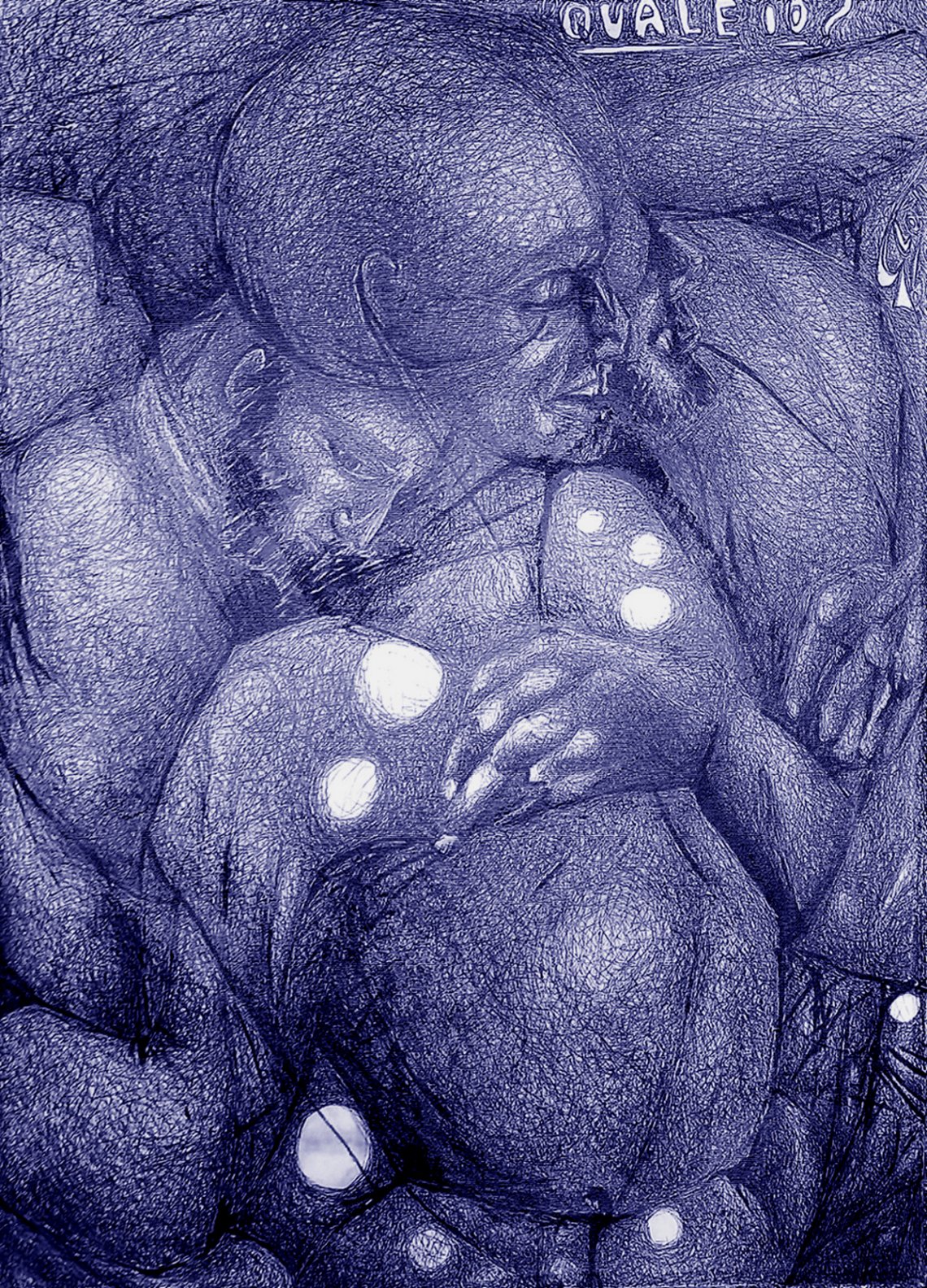 Lavoro stampato su tela dalla foto di una bozza di un mio disegno scomparso a Buenos Aires; poi lavorato a biro, l’ho finito con un protettivo potente per non dover mettere vetro.