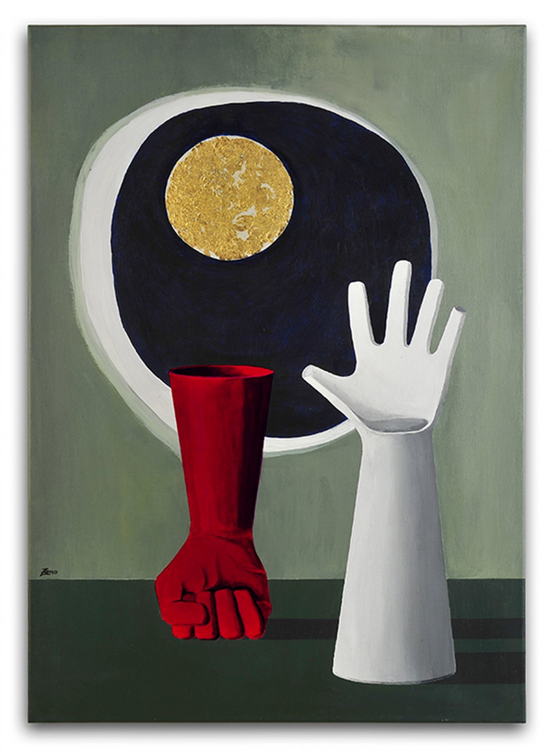 Questo quadro (acrilico con foglia d'oro su tela) fa partre della serie "I vasi di Zeno". Mi piace pensare che ogni uomo sia un ”VASO". Così è nata la serie "Vasi di Zeno", la mia metafora, gioiosa, ironca e un po' irriverente, dell'essere umano durante la propria esistenza.