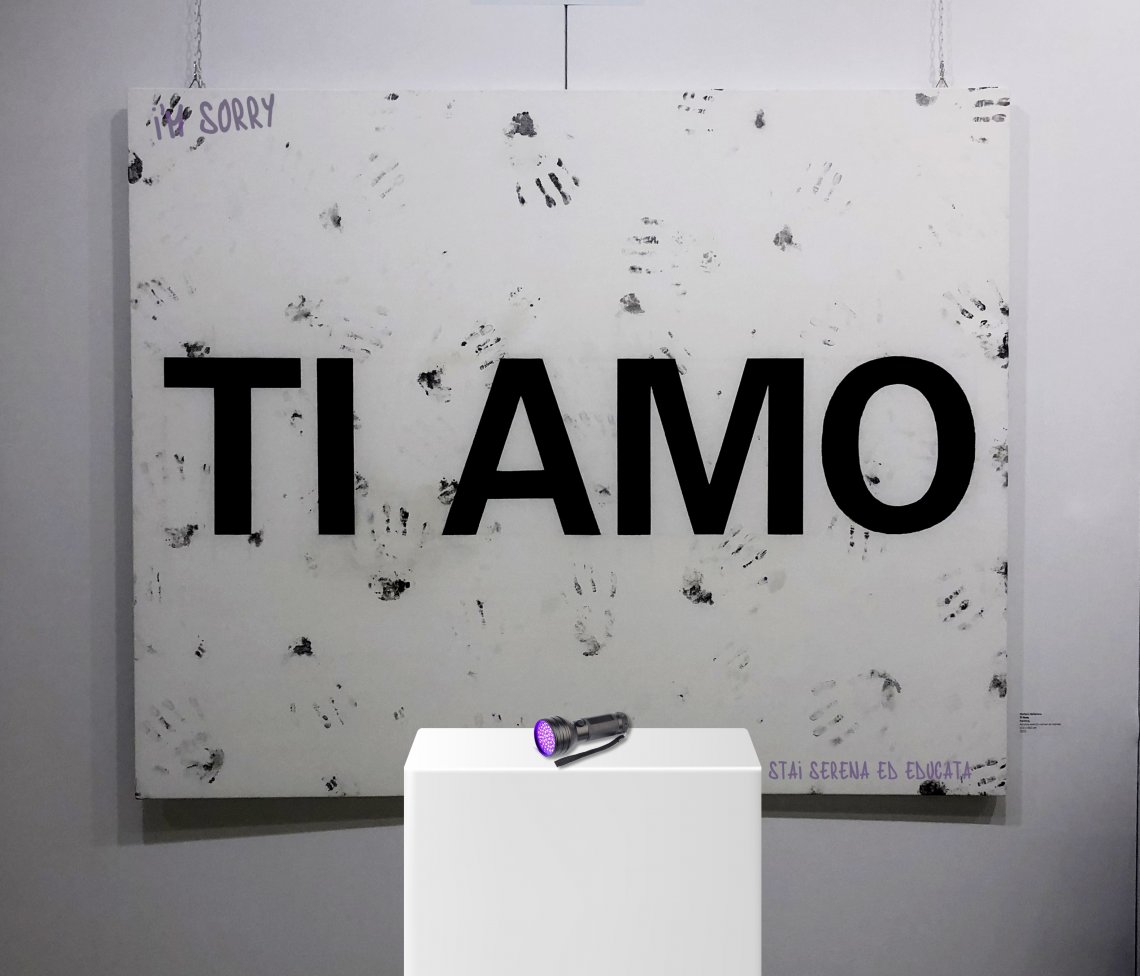 Il progetto prevede una tela bianca che presenta inizialmente la frase “TI AMO” circondata da un pattern di impronte; intorno alla scritta sono state riportate frasi reali estrapolate da chat private, rese pubbliche per denunciare amori ossessivi, possessivi e tossici; alcune sono minacce, altre insulti e così via; tali frasi sono state trascritte tramite inchiostro UV, ossia un pigmento invisibile che il pubblico potrà leggere solo usando una specifica luce messa a disposizione davanti la tela.