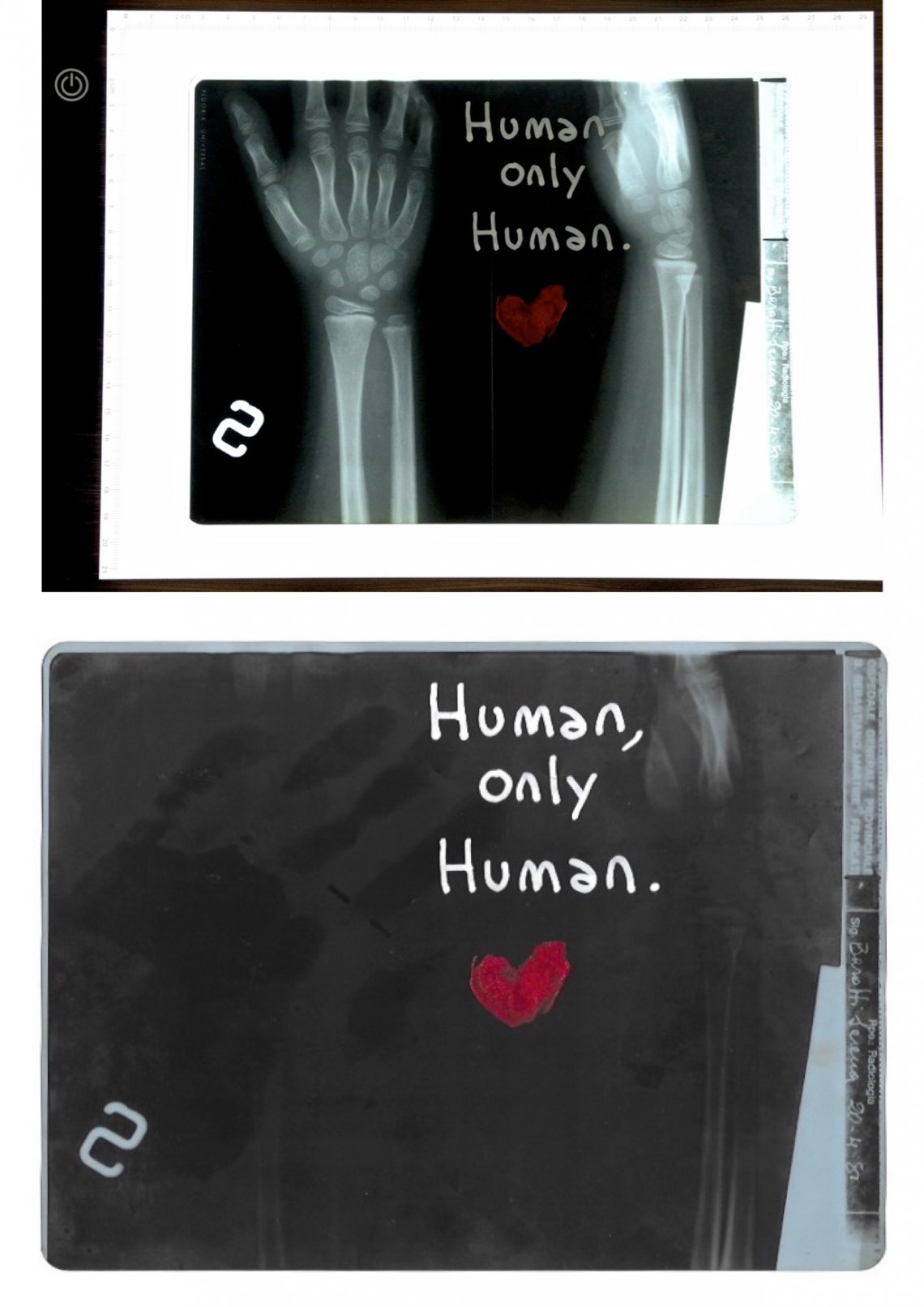 Sul lato destro si può leggere il mio nome e la data dello scatto: 20/04/1981. Mi ero fatta male, caduta mentre pattinavo. E’ una delle mie storie. Si immaginava un polso slogato. Il mio braccio nel tempo è cresciuto, si è trasformato, è diventato adulto. Così come la mia mano. Lo scorrere del tempo, la crescita, la trasformazione, il materiale organico, le cicatrici, la vita non appartengono e non potranno mai appartenere all’Intelligenza Artificiale, che potrà imparare a riprodurre anche il dipinto più importante e difficile della storia umana, ma non sarà mai in grado di riprodurre un’Opera come questa.