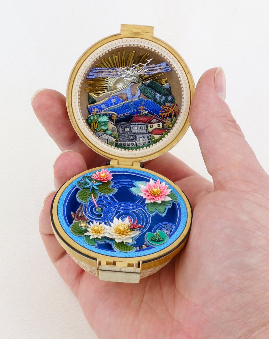 The structure of the work was inspired by the prayer nuts made at the beginning of the 16th century by the master miniaturists of northern Europe. These small boxwood spheres entirely carved with rosettes and which contain very detailed miniature religious scenes were used at the beginning of the Renaissance as an aid to personal devotion. Their owners, letting their minds wander among the profusion of ornaments and narrative scenes, used them as a support for religious meditation. With "Sunrise over Haku Mountain", I wanted to create a similar object that invites the viewer to recenter and find calm by letting their gaze wander through the parchment’s landscapes that make up my work. He will be able to travel in thought and admire the sunrise on Mount Haku, one of the three sacred mountains of Japan, and admire the carps in Komatsu City's Rojo Park.