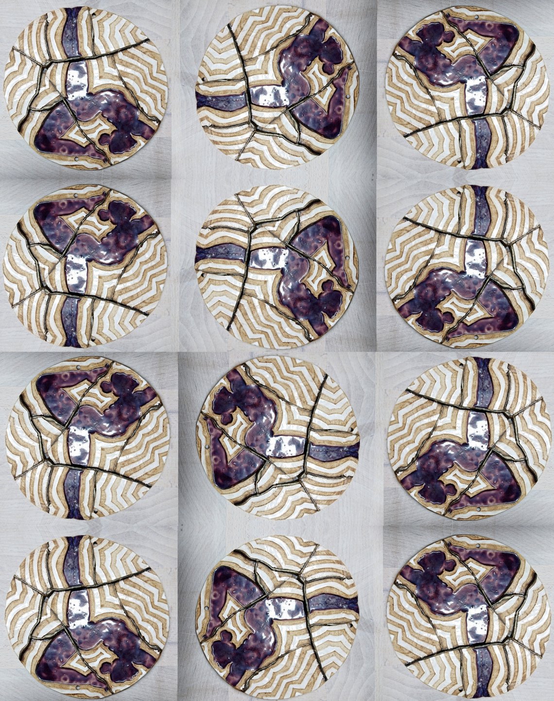 The infividual plates are all the same impression, but glazed with whit white OR black lines. The violet engobe inside of the figure is applied differently every time and glazed transparent and glossy. The overlapping "scars" are first glazed and then painted with a semi-matte bronze acrylic paint. each plate has small holes to carry the one benath it or be hanged.