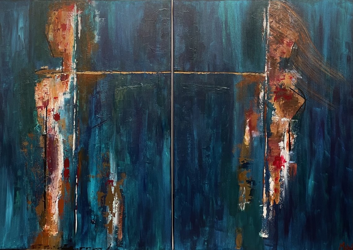 “A metà strada” è un’opera composta da due tele comunicanti. La dimensione totale è 70x100cm ed è realizzata in acrilico su tela. L’opera vuole rappresentare una separazione che però non si vuole o non si può accettare. Due persone rimangono così legate per sempre, nonostante i loro sguardi siano rivolti altrove, verso l’esterno della tela - dove noi non possiamo guardare.