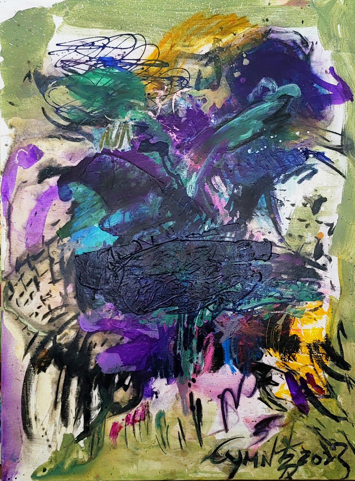 The unique aesthetic of this painting is a fusion of the fluidity and freedom of abstract expressionism with the contemplative practice of Zen calligraphy. This integration of passionate energy and meditative stillness presents a landscape that is holistically dynamic and contemplative, evocative, and reflective.
