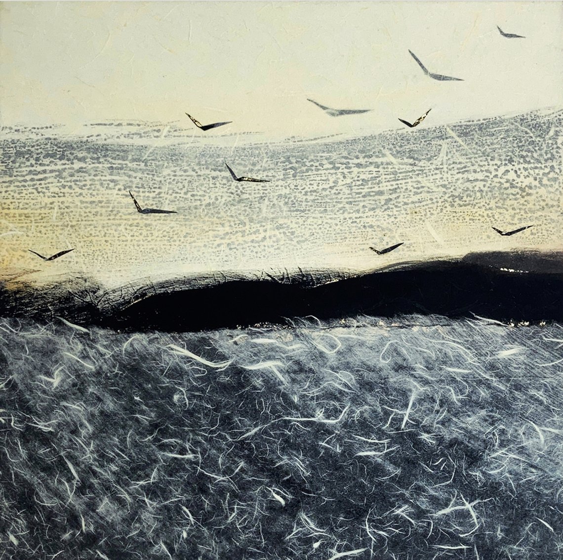 Tecnica: tesuki washi (carta giapponese fatta a mano) dipinta e montata su tela, foglia oro.
