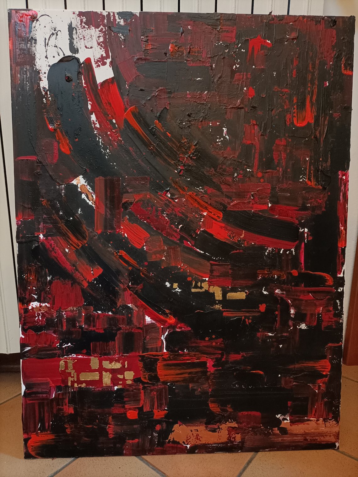 Acrilico su tela. Un demone nero si insidia nell'anima e confonde l'amore col possesso, con la gelosia. E sfocia in un male cieco, sfigura, strangola, uccide. Questo cosiddetti amore è in realtà un veleno, che nelle vene si trasforma in tante sfumature di sangue.
