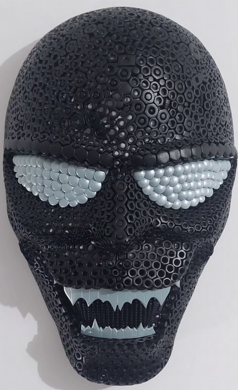 Ce masque de métal constitué d'écrous soudés les uns aux autres comme autant de molécules constitutives du vivant, se veut être à mi-chemin entre les deux mondes . Une représentation en 3 dimensions de notre double sauvage.