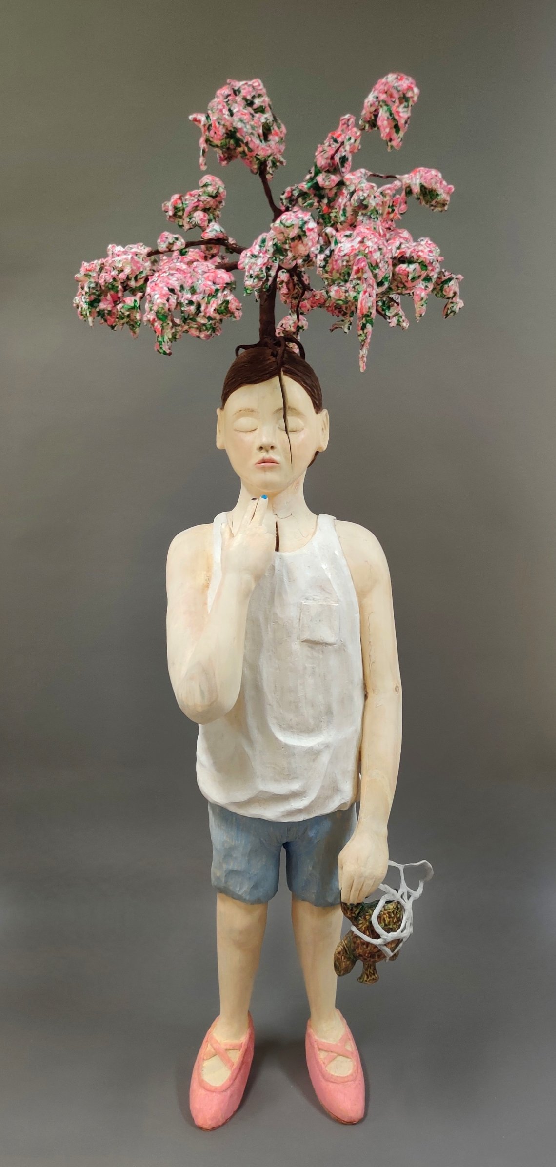 Aspen wood,clay,urethane, oil & acrylic paint 55x157x55cm 2023 This sculpture is about fear of the world that we are leaving to future generations. But there is also hope. This time in the world that we are living can be just a waking dream and we wake up to a better tomorrow.