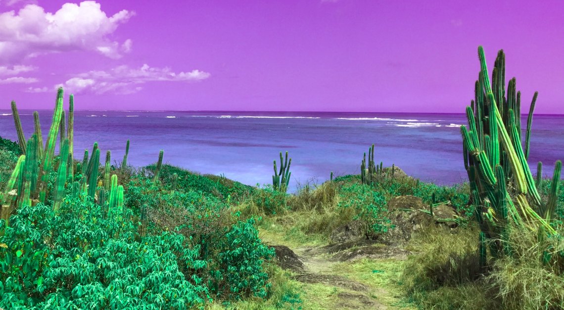 A pic that has been shot with natural light during a very hot day. The genuine photo is very paradisiac, but quite "cliché" with the turquoise sea, the céladon coral reef waters, the blue sky etc. Nevertheless, as there was absolutely nobody during this coastal hike, I really had the feeling to be on another planet. Thus, I took the photography back after a while and decided play with colors and saturations with a basic software in order to create and make visible my inner sensations when I was there. That leads to a real kind of cinematic desert-lunar chromatic world, I'd really love to go one day. A dreaming landscape.