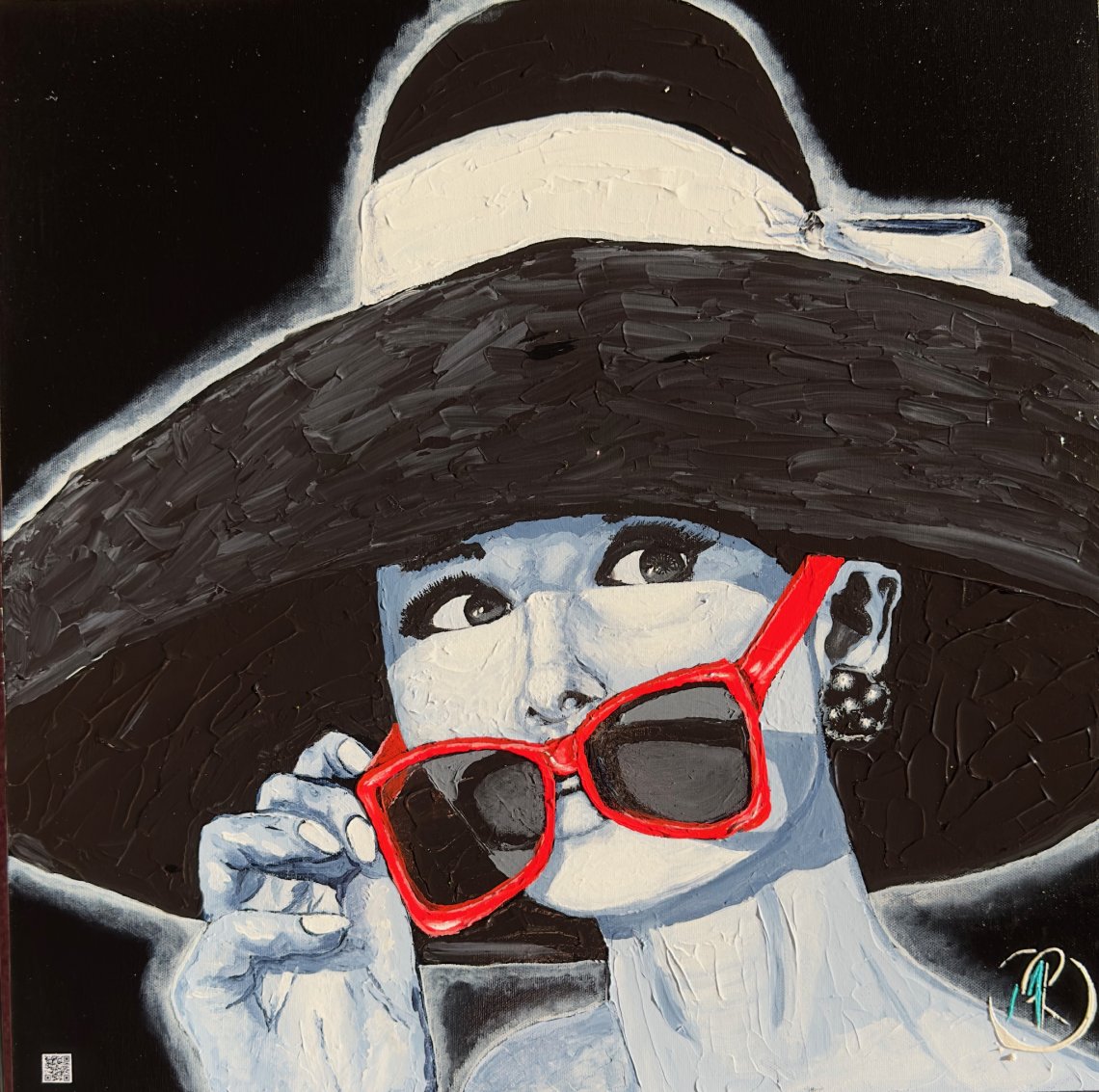 This artwork is a striking representation of Audrey Hepburn, an icon of elegance and philanthropy. Created using acrylic on canvas, with a knife technique, this painting gives a unique texture and adds depth to the image. The dimensions of the artwork, measuring 20 inches by 20 inches, give it a striking visual presence. Every detail is carefully worked to capture Audrey Hepburn's timeless beauty. The QR code present in the artwork leads to an exploration of Audrey Hepburn's relationship with fashion, an important aspect of her life and career. This allows viewers to delve deeper into the world of this style icon. The artwork "Audrey" evokes an impression of timeless grace and charm. It captures not only Audrey Hepburn's outer beauty, but also her inner strength and commitment to philanthropy. In conclusion, "Audrey" is a remarkable piece of art that pays homage to a legendary icon. The technique used, the dimensions of the artwork, and the QR code add an additional dimension to this creation, creating a visual and interactive experience for viewers. It is a piece that is sure to fascinate and inspire all who contemplate it.