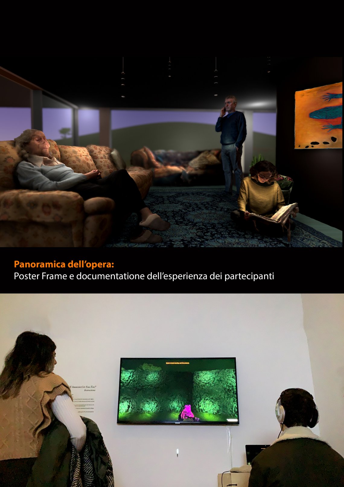 This interactive experience is aimed to be experienced individually, using a pair of headphones to hear the stereo sounds and the narration that guides them through the visual journey of the story, observing the environment unravelling on a wide screen in front of them and be surprised by their participation in the story, as this is the turning point of the piece.