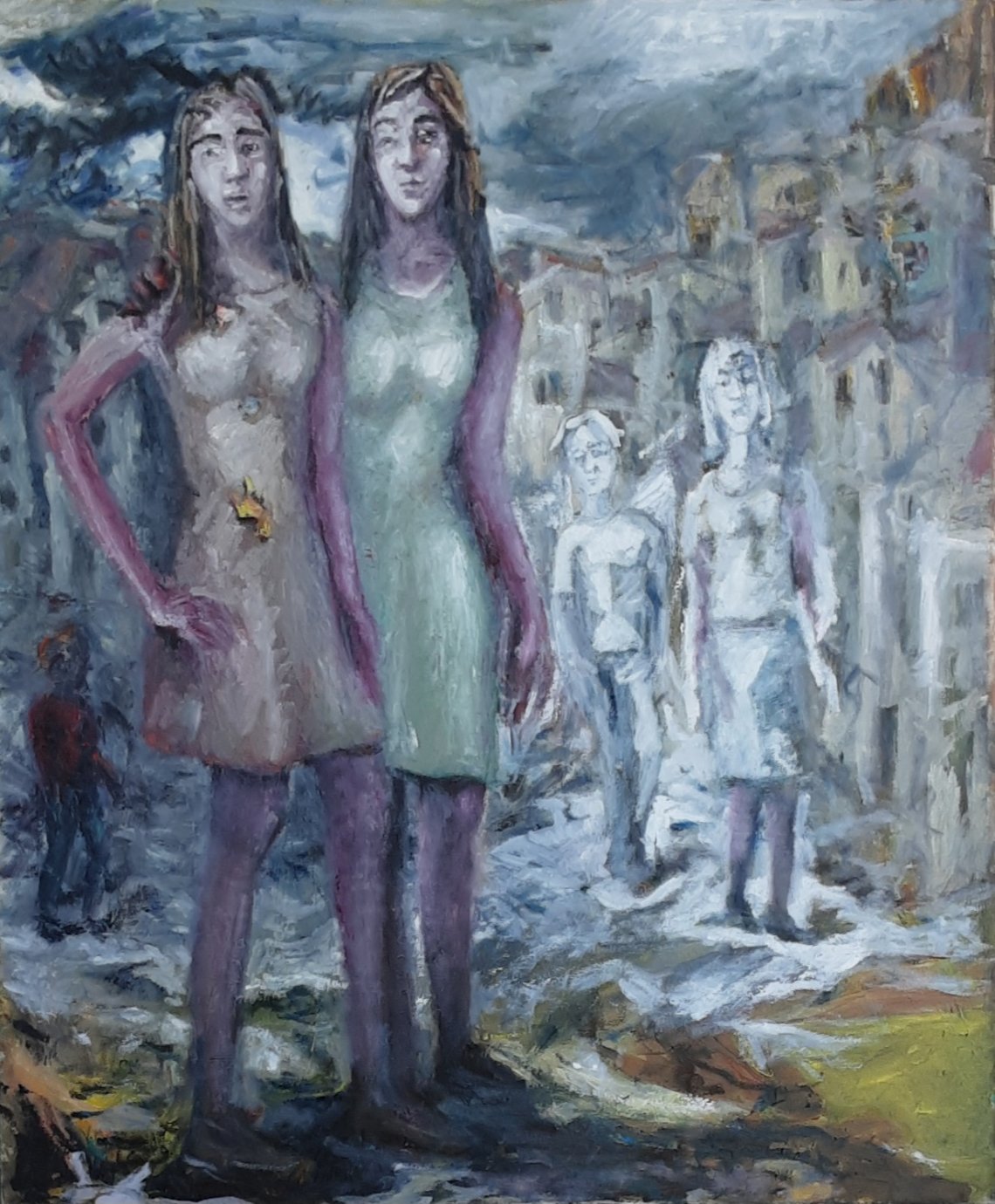 Olio su tela 80x95  l'artista dalla materia amorfa del reale crea un'insieme di figure .