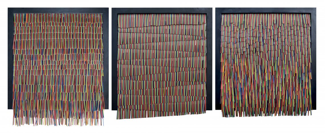 Viviamo in una società in cui il digitale è sempre più consolidato nella nostra realtà, in cui navighiamo con confidenza in una dimensione wireless. Il virtuale diventa così una dematerializzazione della realtà, dove le cose perdono la loro materialità, le non-cose risultanti vengono vissute come simulacri di cose, corpi senza corpo o fantasmi di corpi. Il trittico mette a nudo questa carne digitale fatta di pvc e rame: 8 poli policromi che compongono un cavo telefonico, primo attore di questo sviluppo tecnologico, che attraverso un processo di esteticizzazione, ammette nel reale ciò che non è rendendolo visibile. Ciò che è reale diventa invisibile, così come l’inquinamento che da esso deriva, spesso sottovalutato. Ogni giorno milioni di server fisici di tutto il mondo lavorano incessantemente 24/24|7/7 per trasmettere i nostri dati in giro per l’etere e una silente invasione di aggrovigliarsi di cavi, fili, componenti e rifiuti elettronici definiscono nuovi paesaggi antropico-digitali.