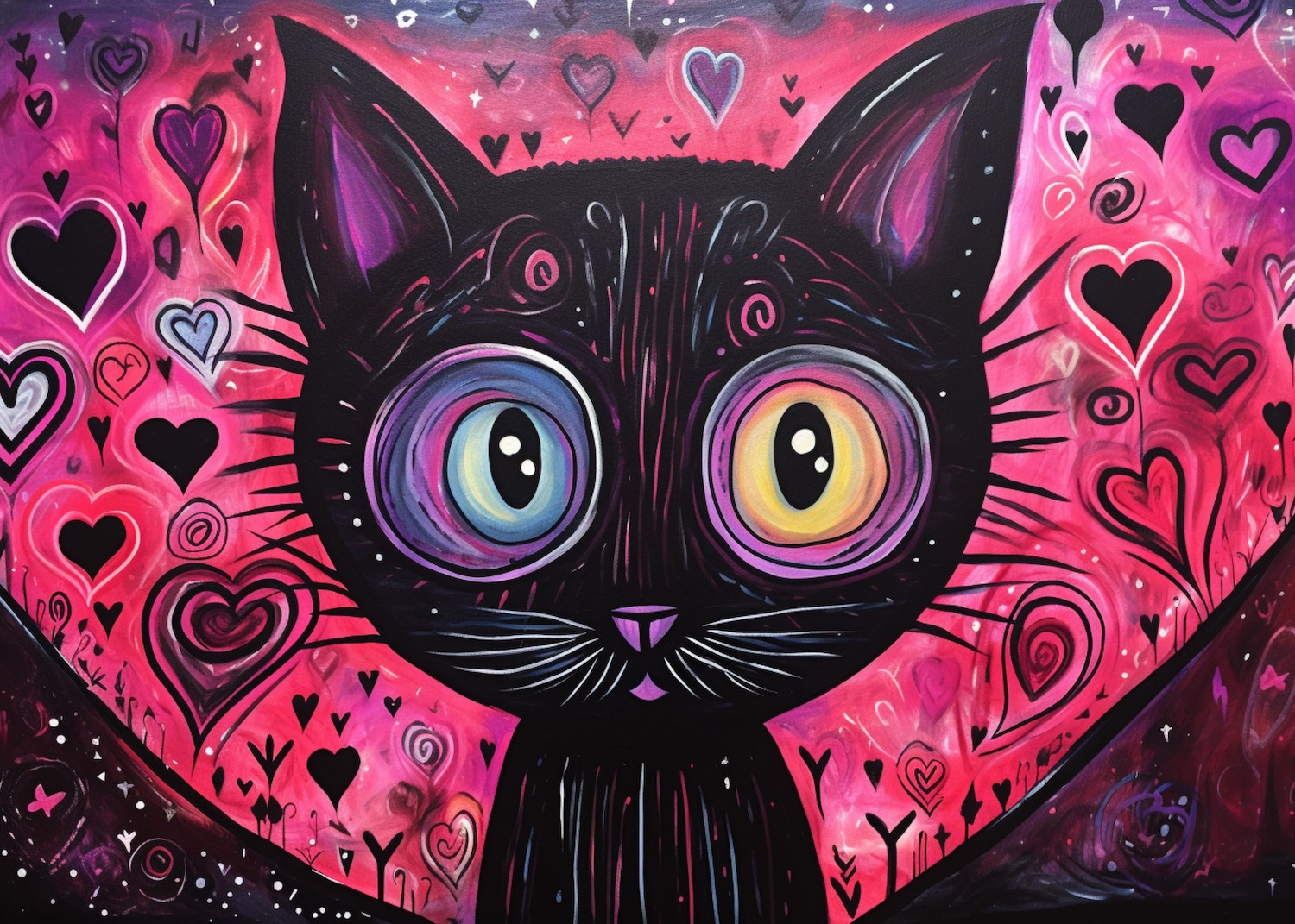 My Best Friend: The Tomcat by Alexandra Laabs (Age 7) Graphic Title: "My Best Friend: The Tomcat" by Alexandra Laabs (Age 7) Graphic Description: "My Best Friend: The Tomcat" by Alexandra Laabs is an adorable embodiment of the young artist's passion for cats, which are not only her favorite animals but have also become the main theme of her work. The graphic depicts a black cat with mesmerizing, multicolored eyes that draw attention and evoke feelings of warmth and joy. In the background, various shades of pink and purple hearts and breezy patterns are scattered, creating a backdrop full of sentiment and delicacy, symbolizing love and passion. The cat seems to be a creature from another dimension where love and kindness prevail. With its contrasting, vibrant colors and bold lines, the graphic takes on the character of a fun and lively interpretation of feline personality. Dynamic, swirling lines and patterns bring an element of spontaneity and carefreeness, reflecting the free and independent nature of cats. The entire work is like a window into a fairy-tale world where cats symbolize more than just animals—they become guides through realities full of love and joy. The artist successfully combines her graphic skills with a deep love for cats, creating works that are not only visually stunning but also reflect her personal bond with these animals. Alexandra Laabs' work, despite her young age, shows artistic maturity and the ability to convey emotions through digital art. Graphic Details: Author: Alexandra Laabs (Age 7) Signature: Signed by the author. Frames: Unframed, printed and stretched on a stretcher bar frame. Optional wooden frame offered. Size: 50 cm x 70 cm (100 x 140 cm also available) Series: "Kitten’s Love" Quality and Durability: High-quality canvas print, UV-printed, ensuring vibrant colors for many years. Painting Technique: Computer graphic, UV-printed. Optional: Wooden frame available. Certificate of Authenticity: Included with the original graphic print Discounted List Price: 130 EUR for individual customers. List Price Without Discount: 329 EUR. Sale Price for galleries: 30% discount off the list price. Il mio migliore amico: Il gatto di Alexandra Laabs (7 anni) Titolo della Grafica: "Il mio migliore amico: Il gatto" di Alexandra Laabs (7 anni) Descrizione della Grafica: "Il mio migliore amico: Il gatto" di Alexandra Laabs è un'affascinante incarnazione della passione della giovane artista per i gatti, che non sono solo i suoi animali preferiti, ma sono anche diventati il tema principale della sua opera. La grafica raffigura un gatto nero con occhi ipnotizzanti e multicolori che attirano l'attenzione e suscitano sentimenti di calore e gioia. Sullo sfondo, in varie tonalità di rosa e viola, sono sparsi cuori e motivi leggeri, creando uno sfondo pieno di sentimento e delicatezza, simbolizzando l'amore e la passione. Il gatto sembra essere una creatura di un'altra dimensione dove dominano l'amore e la gentilezza. Con i suoi colori vivaci in contrasto e linee audaci, la grafica assume il carattere di un'interpretazione divertente e vivace della personalità felina. Le linee dinamiche e ondulate e i motivi portano un elemento di spontaneità e spensieratezza, riflettendo la natura libera e indipendente dei gatti. L'intera opera è come una finestra in un mondo fiabesco dove i gatti simboleggiano più che semplici animali - diventano guide attraverso realtà piene di amore e gioia. L'artista combina con successo le sue abilità grafiche con un profondo amore per i gatti, creando opere che non sono solo visivamente stupefacenti, ma riflettono anche il suo legame personale con questi animali. L'opera di Alexandra Laabs, nonostante la sua giovane età, mostra maturità artistica e la capacità di trasmettere emozioni attraverso l'arte digitale. Dettagli della Grafica: Autrice: Alexandra Laabs (7 anni) Firma: Firmata dall'autrice. Cornici: Senza cornice, stampato e teso su telaio. Opzionalmente disponibile in cornice di legno. Dimensioni: 50 cm x 70 cm (disponibili anche 100 x 140 cm) Serie: "L'amore dei gattini" Qualità e Durata: Stampa su tela di alta qualità, stampata con inchiostri UV, per una lunga conservazione dei colori. Tecnica di Pittura: Grafica computerizzata, stampata UV. Opzionalmente: Cornice di legno disponibile. Certificato di Autenticità: Incluso con la stampa grafica originale. Prezzo di Listino Scontato: 130 EUR per i clienti individuali. Prezzo di Listino Senza Sconto: 329 EUR. Prezzo di Vendita per le gallerie: sconto del 30% sul prezzo di listino.