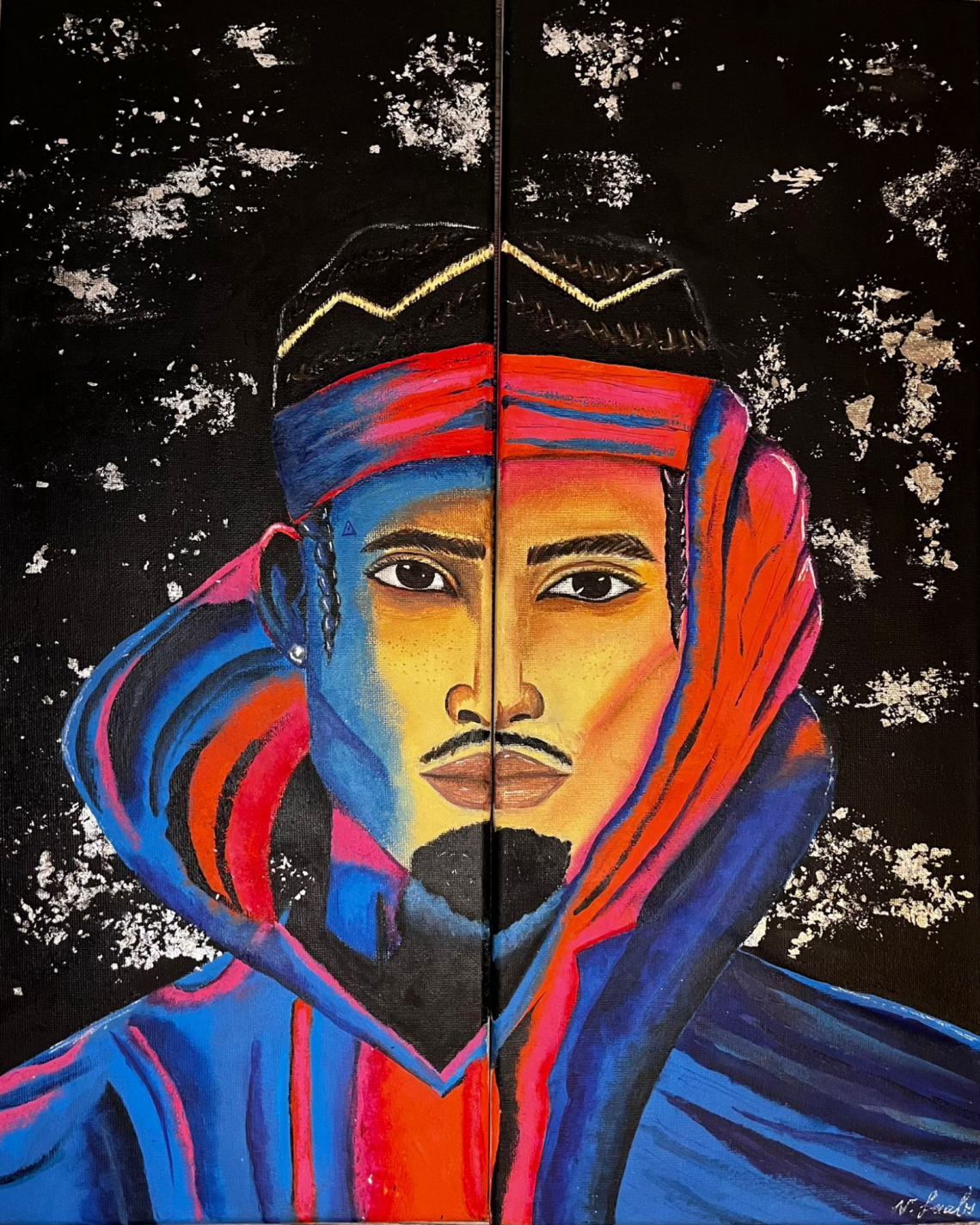 "Breezy in Red and Blue: Dual Portrait" is Victoria Laabs' artistic interpretation of the dynamic R&B, pop, and hip-hop music scene, inspired by such artists as Chris Brown. The portrait embodies the energy and passion resonating with the youth and Victoria's own artistic aspirations.