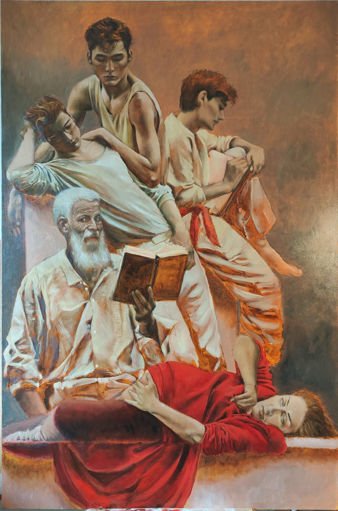 Il gruppo di giovani osserva quindi l’episodio in maniera distaccata, con una conoscenza mediata dai mezzi di comunicazione (il libro, i testi scritti) che sono in appannaggio di altri. Si crea così anche il rapporto con il personaggio anziano, di una generazione che ha vissuto senza i mezzi di comunicazione odierni e che ha osservato in prima persona momenti storici difficili, l’unico in grado di osservare direttamente e, invece, intento a guardare lo spettatore in maniera ambigua.