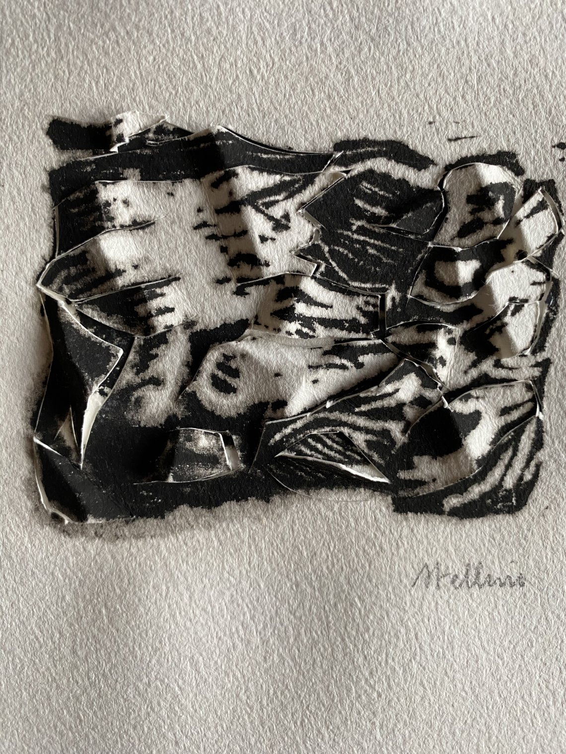 Stellino lavora su carta umida, che allevia la durezza delle linee di stampa. L'acqua crea una sorta di inquadratura che garantisce una posizione definita al piccolo motivo.