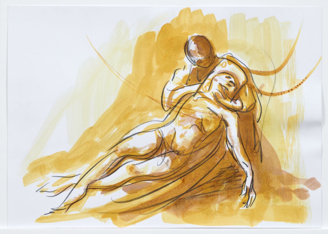 Alberto Magri ben conosce l’iconografia sacra; da restauratore l’ha frequentata in tutte le sue sfumature, nelle varianti storiche e simboliche. Ma impostare lo studio per una Crocifissione certo non si riduce a una scelta di repertorio, dal quale esula poi la Pietà concepita in tempi di pandemia: Madre, Figlio, lo strazio del Sacrificio e la pena aggiuntiva di due tubi da cui trarre gli ultimi asettici respiri.