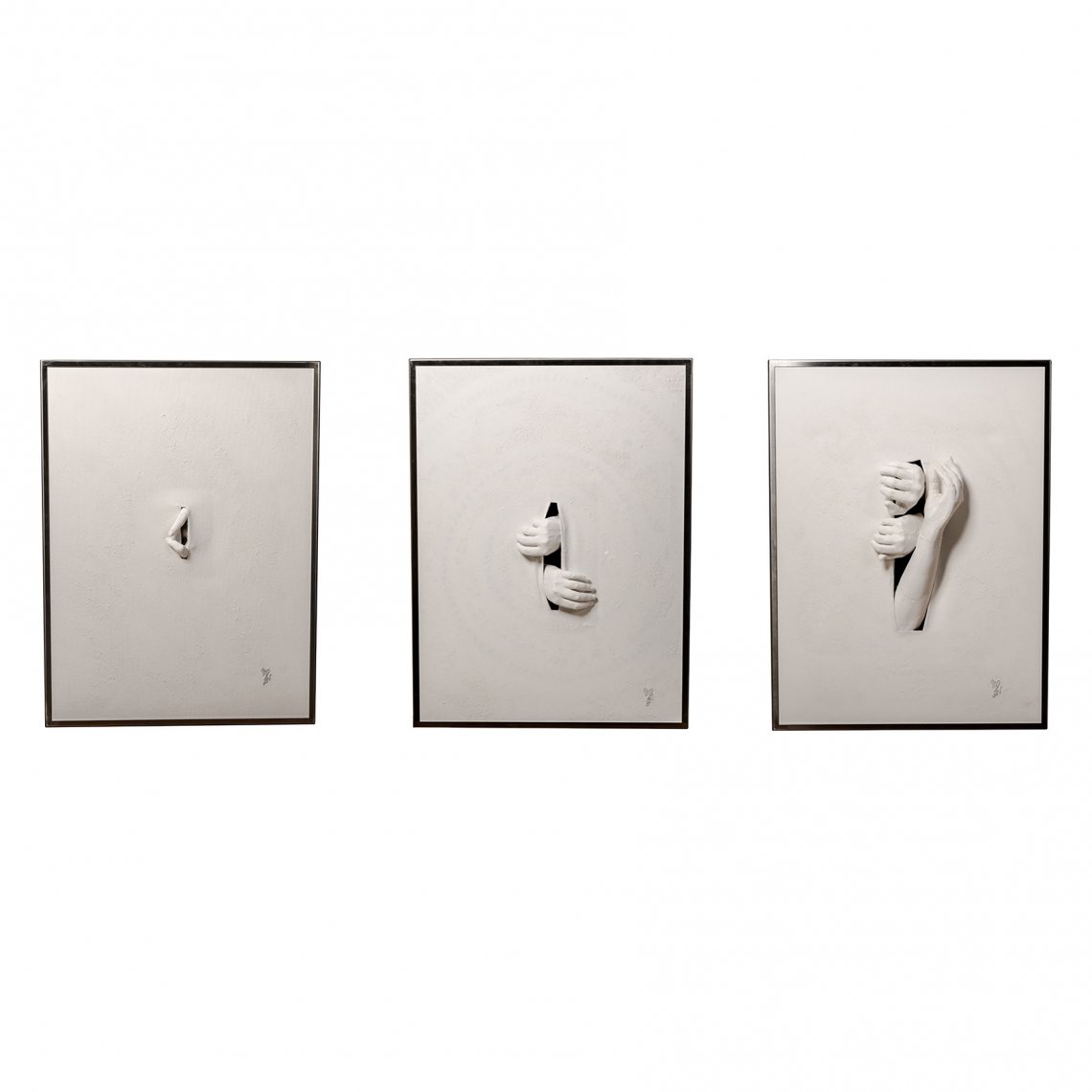 Un trittico di tele dalle cui fenditure compaiono dapprima dita, poi mani, infine quasi una folla nascosta al suo interno. L’idea dell’arte che nasce incontenibile da un supporto bianco ed apparentemente sterile porta lo spettatore a riflettere sul processo creativo