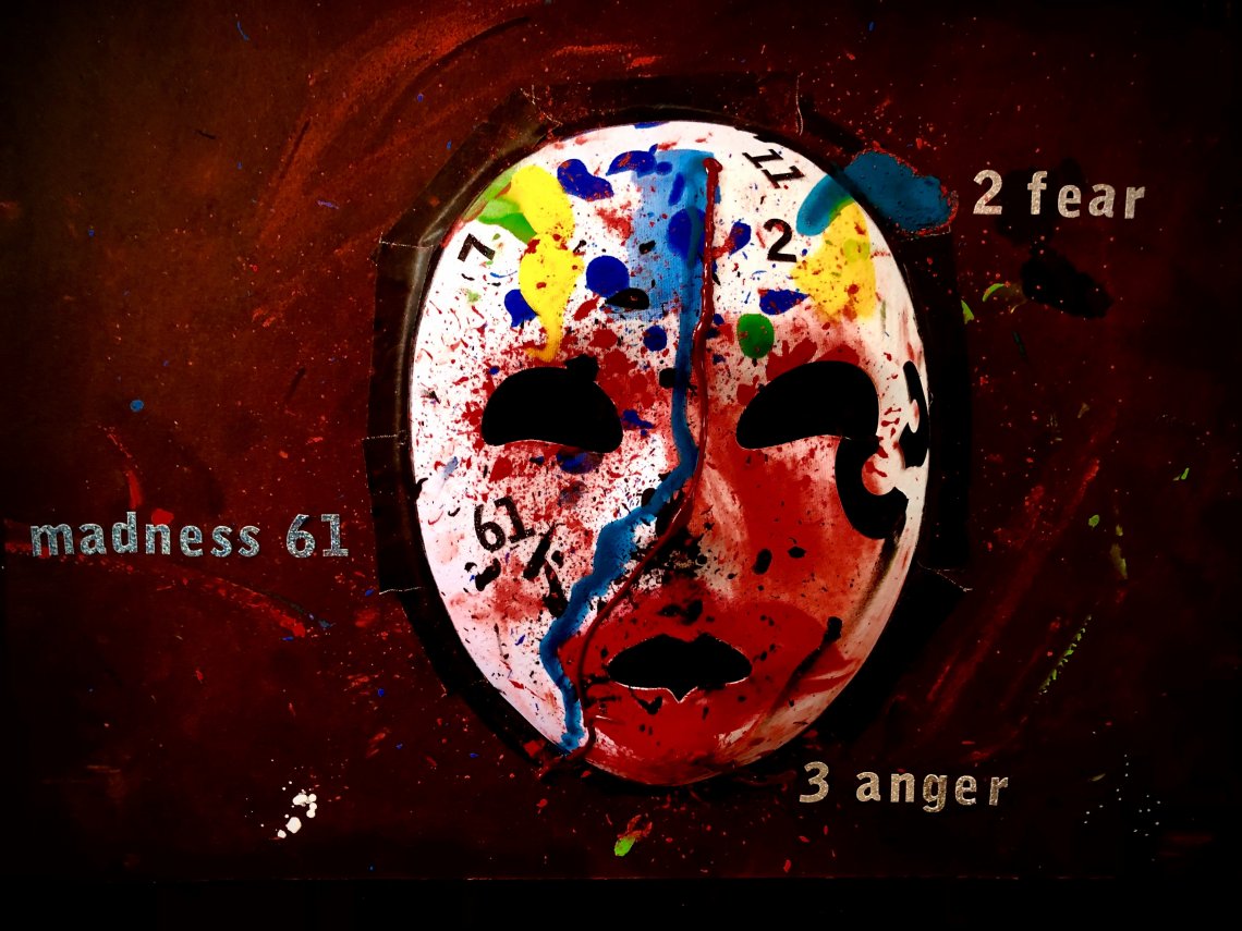 The mask ‘Anger is Red’ represents one of the main emotions of ‘Ma Machine d’Emotions’. The emotion Anger is represented by the prime number 3, and strongly connected to the emotion Impotence (prime number 41).